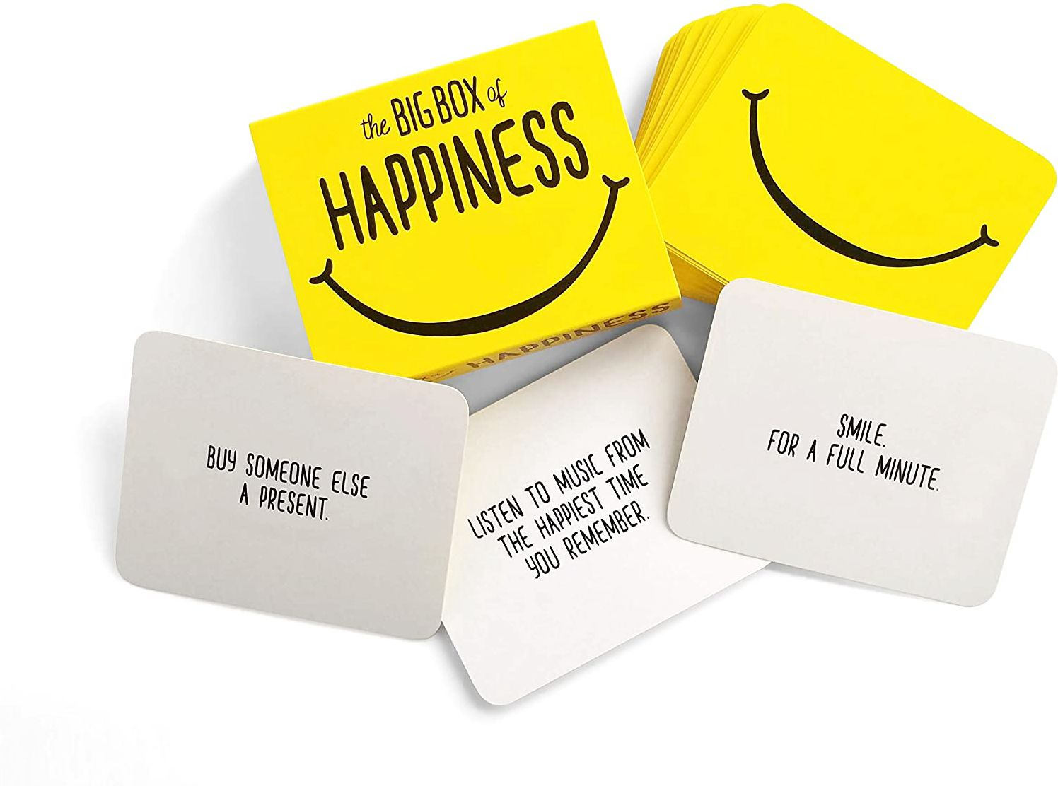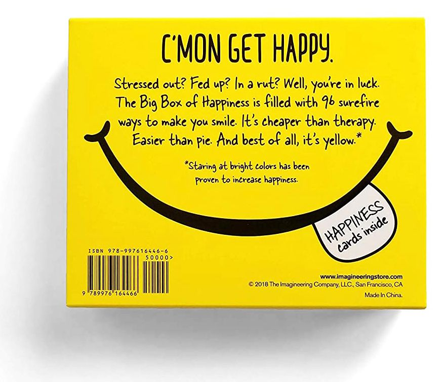 C’mon Get Happy. Stressed out? Fed up? In a rut? Well. you’re in luck. The Big Box of Happiness is filled with 96 surefire ways to make you smile. It’s cheaper than therapy. Easier than pie. And best of all. it’s yellow. (Staring at bright colors has been proven to increase happiness.)