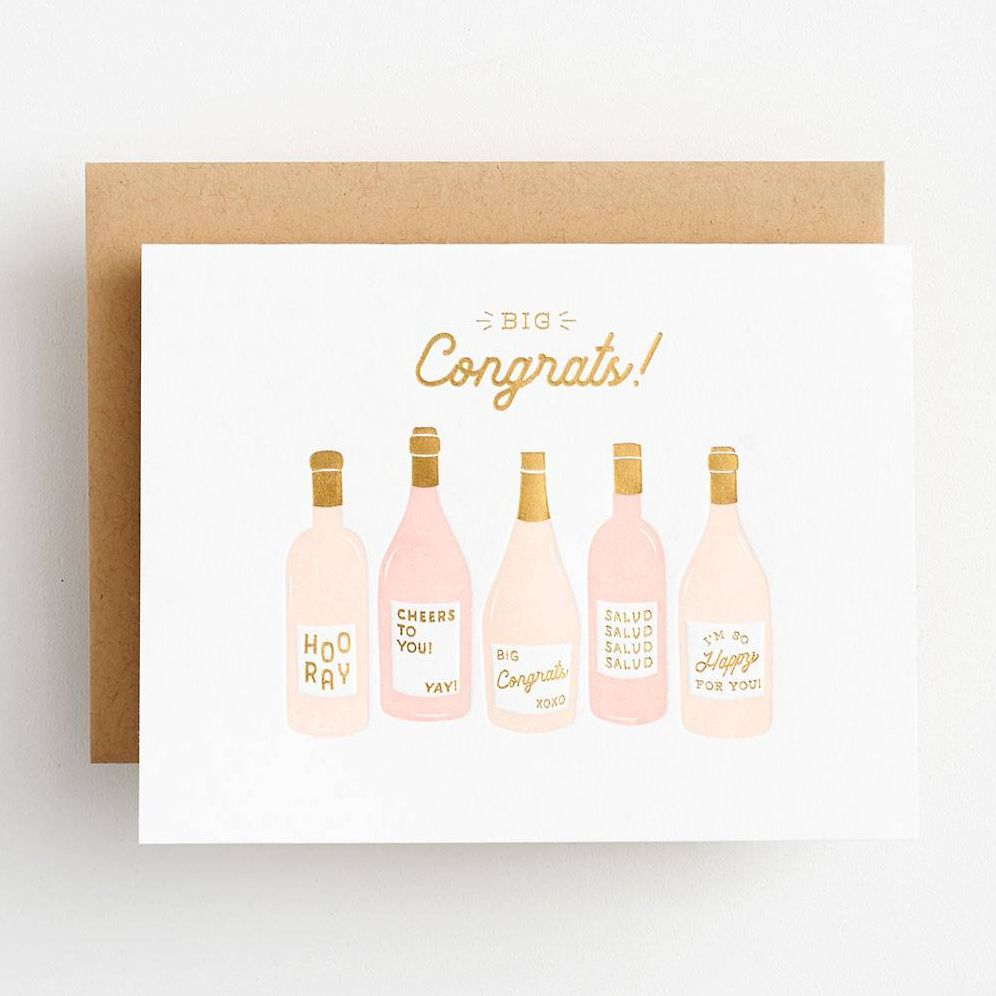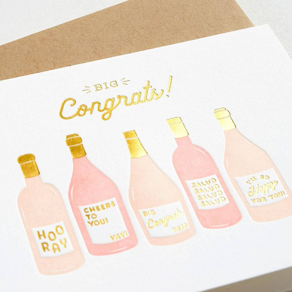 Wish a big congrats with this card featuring rosé bottles. Letterpress printed with gold foil detail. Accompanied with matching kraft envelope. Folded card. Blank inside. By Elum.