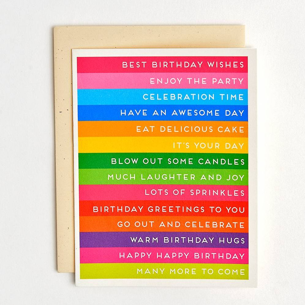 Send well-wishes of a perfect birthday with this bright and colorful card. Each stripe reads birthday sayings and wishes for a special day!