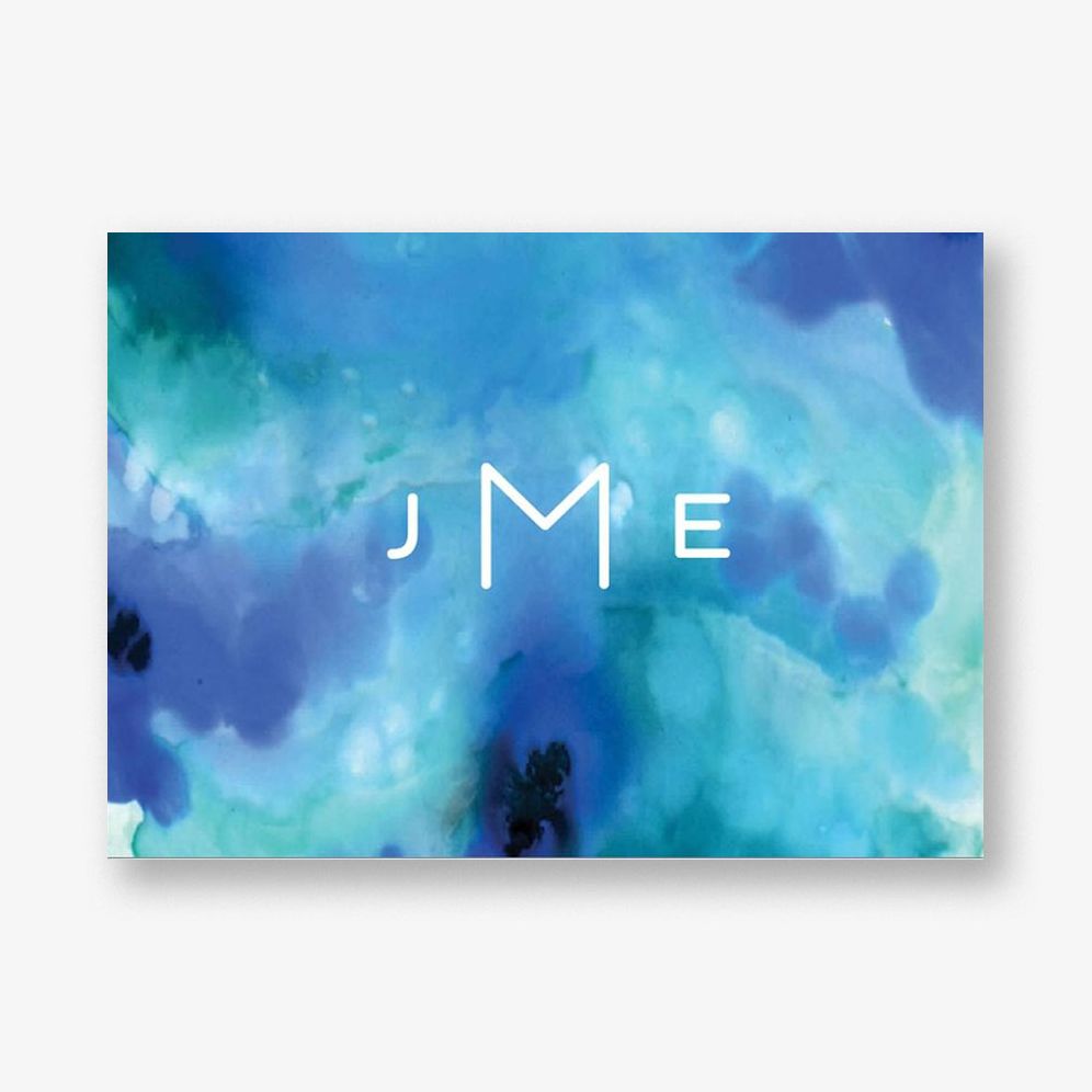 Hues of splashy blue abstract surround your initials on this perfect design. Great for sending a thank you or other handwritten note.