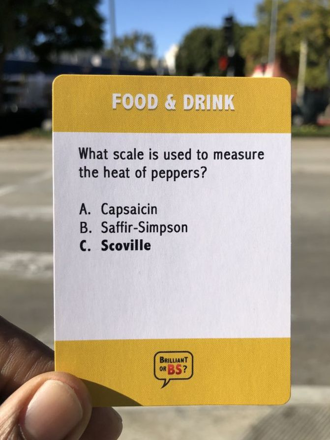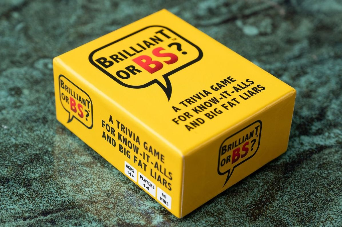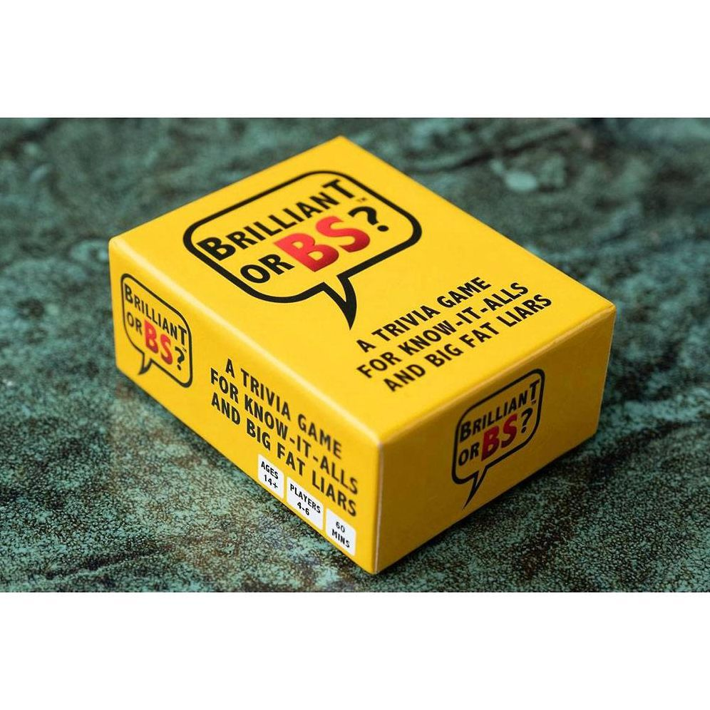 Brilliant Or BS? is a 4-6 player party game for know-it-alls and big fat liars! Players read multiple choice trivia questions and earn points by predicting which of the other players guessed correctly before answers are revealed. Can you tell when your friends are BSing? Play this hilarious party game and find out.There are six different categories of trivia including Sports. Entertainment. Food & Drink. Science & Technology. Geography and History.Players take turns being the Judge by reading one yellow question card and the three multiple choice answers.The other players have 10 seconds to respond by placing one of their A-B-C answer cards face down.Starting with the player to the Judge’s left and going clockwise. each player tries to convince the Judge that they got the question right without saying the answer. They must come up with a convincing explanation as to how or why they know the correct answer…even if they don’t.After everyone pleads their case. the Judge grabs the two black cards and gives the Brilliant card to the person they think got the question right and the BS card to the person they think got it wrong.The player that receives the Brilliant card automatically earns 2 points and the player who receives the BS card earns 0 points.The Judge announces the correct answer (highlighted in bold) before asking the other players to reveal their cards. The players who did NOT receive a Brilliant or BS card go first. followed by the player who received the BS card. The person who received the Brilliant card reveals their answer last. Each player that gets the question right earns 1 point.The Judge receives 1 point for each correct Brilliant prediction and 1 point for each correct BS prediction. But beware. For each wrong prediction. the Judge loses 1 point.Play continues until each person has had the chance to be the Judge the same number of times. The player with the most points at the end of the game wins. (Suggested length of game play is 1 hour.)For Ages: 14+WARNING: Choking Hazard; Small Parts. Not for children under 3 years old.