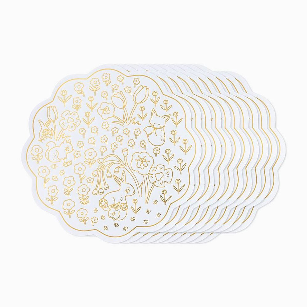 Gold foil placemats with the cutest bunnies in grass and florals. Put these on your table as is or give them to the kids to draw on! Pair with our die cut bunny plate and our guest napkin for a full table set! Designed by Paper Source.