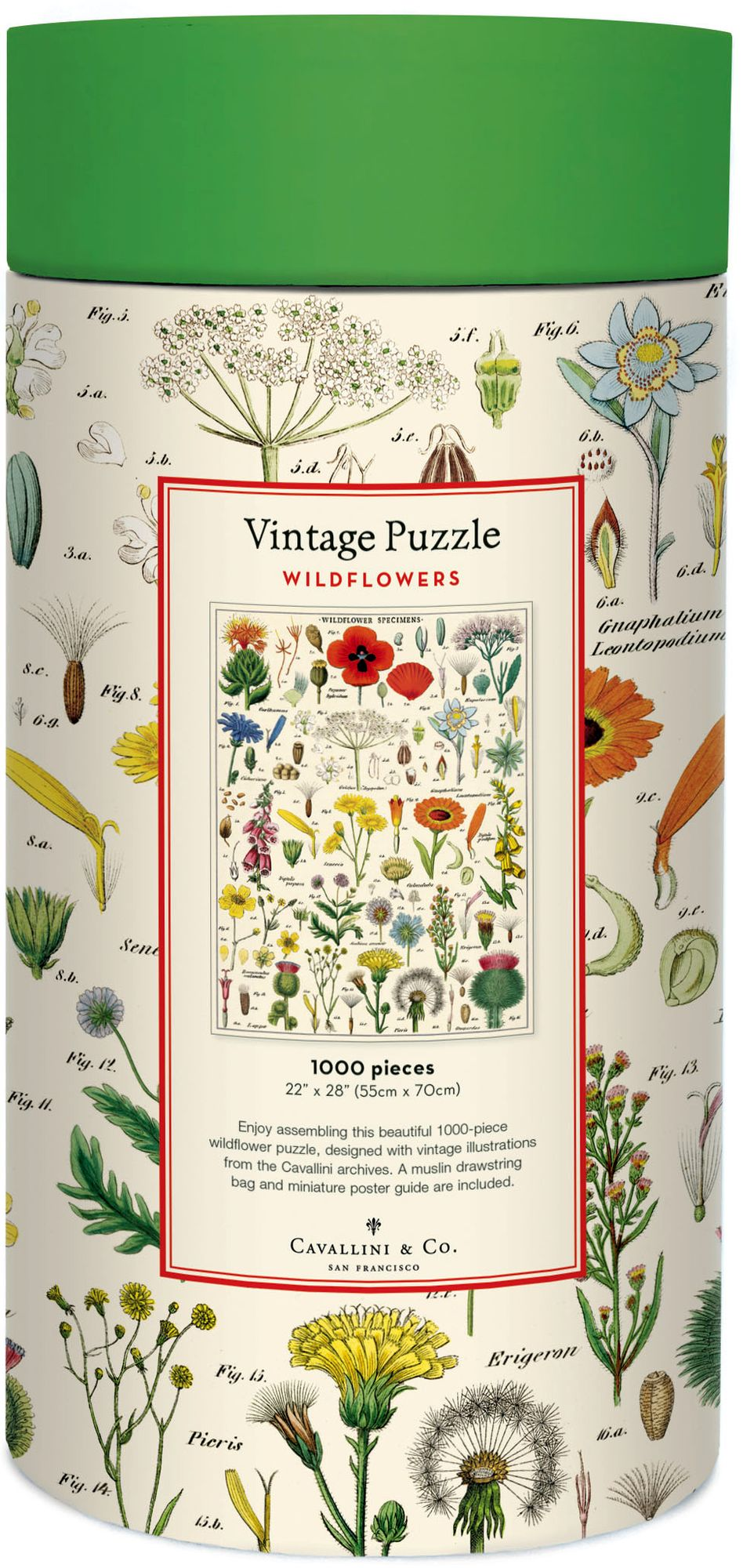 This 1.000 piece jigsaw puzzle features vintage art of beautiful wildflowers. each with its scientific name alongside.