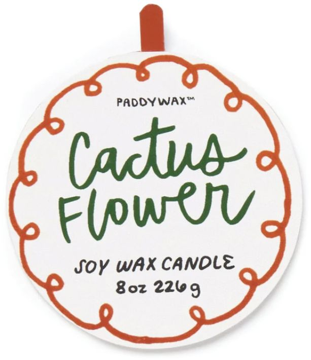 This ceramic cactus flower candle features green and coral flowering cactus illustrations on a pale blue backdrop. The Cactus Flower scent features top notes of Bergamot. Dewy Pear. Apple Blossom and Coconut Water; middle notes of Cactus Flower. Gardenia. White Peony and Aloe Vera; bottom notes of Matcha Tea. Muguet. Vanilla Bean and Bamboo.