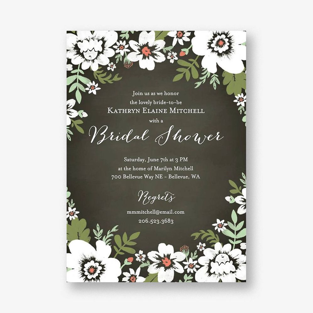 Beautiful anemone flowers and greenery frame our lovely bridal shower invitation with style and elegance. The chalkboard-inspired background creates a distinctive look your guests will love. Printed on white 130 lb cover paper with a tactile vellum finish. 100% post-consumer waste. FSC certified.