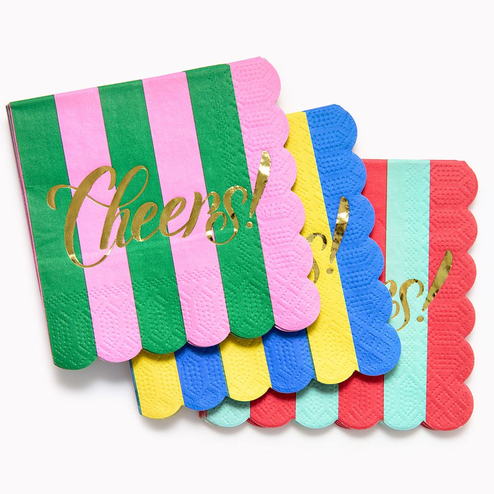 Set of 18 paper napkins featuring stripes. Cheers sentiment and scalloped edges. Great for any gathering! 5 x 5. PS Exclusive.