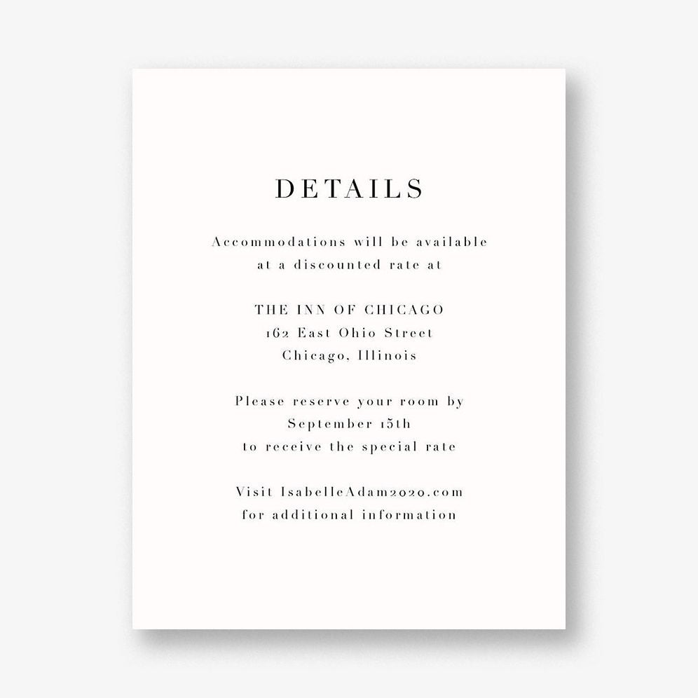Part of the Chicago suite of wedding cards. this information card is a fine accompaniment. Printed on Mohawk superfine white 130 lb. card stock that is soft to the touch and matches our superfine white envelopes. Paper is FSC certified and made using wind power.