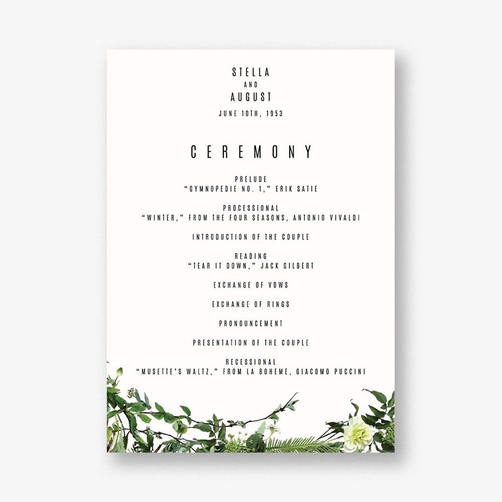Floral arrangements are what make weddings even more magical than they already are in essence. Inform all your loved ones on your big day with this floral wedding program by Paperless Post. Printed on Mohawk superfine white 130 lb. card stock that is soft to the touch and matches our superfine white envelopes. Paper is FSC certified and made using wind power.