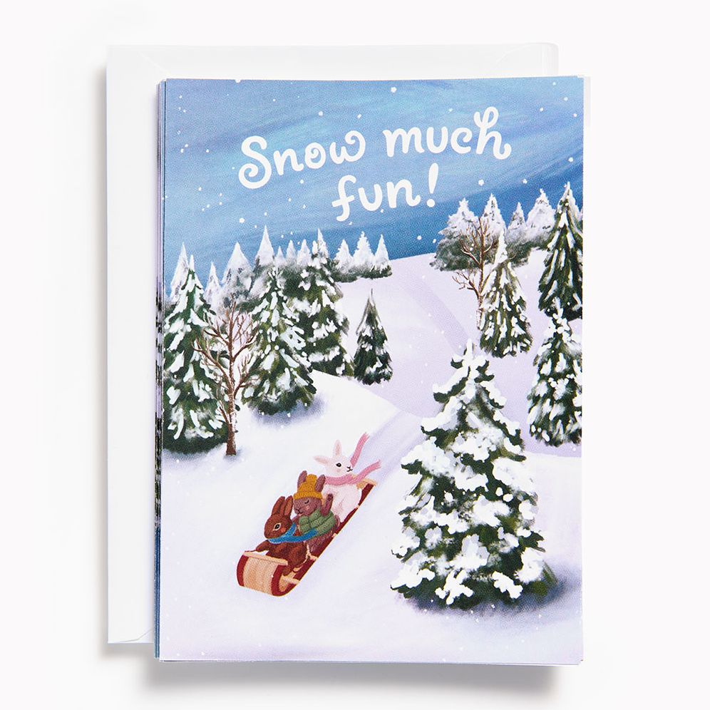 Spread some holiday cheer with this Christmas card set featuring adorable bunnies sledding in the snow!