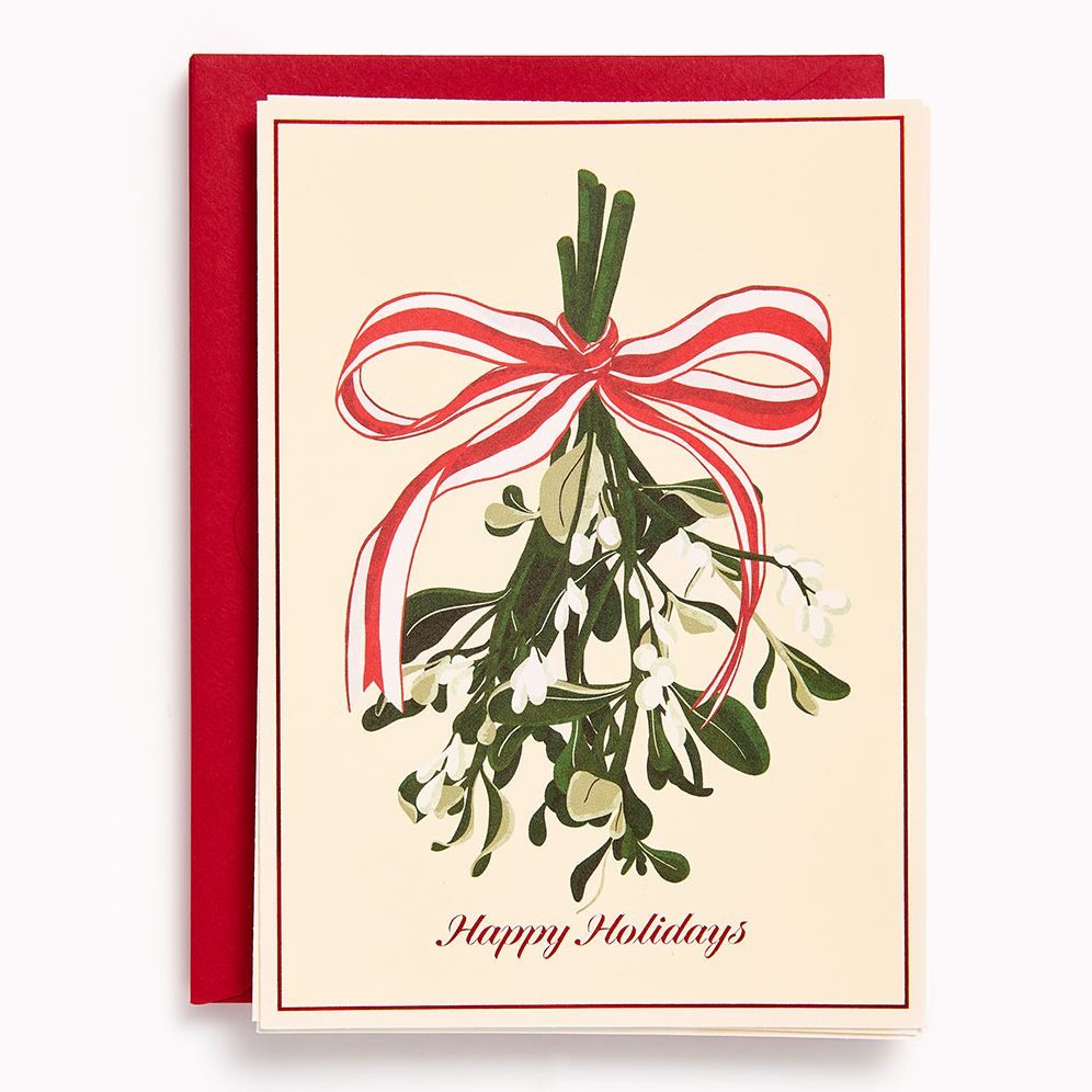 Spread some holiday cheer with this Christmas card set featuring a beautiful mistletoe bunch tied with striped ribbon!