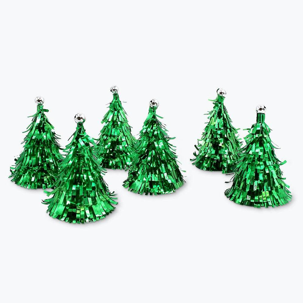 Rock around the Christmas tree with these adorable fringed hats. featuring green foil in the shape of a tree and topped with a jingling bell.