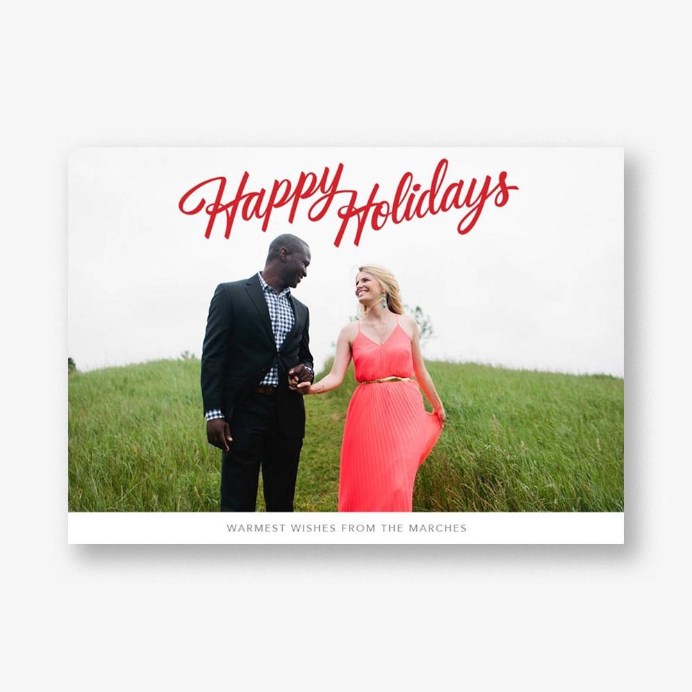 Spread magic and love with Paperless Post holiday photo cards this season. Personalize each card with a family photo and send it to those you love. This holiday card features a script font that reads Happy Holidys and is can be personalized with your family name in the footer!
