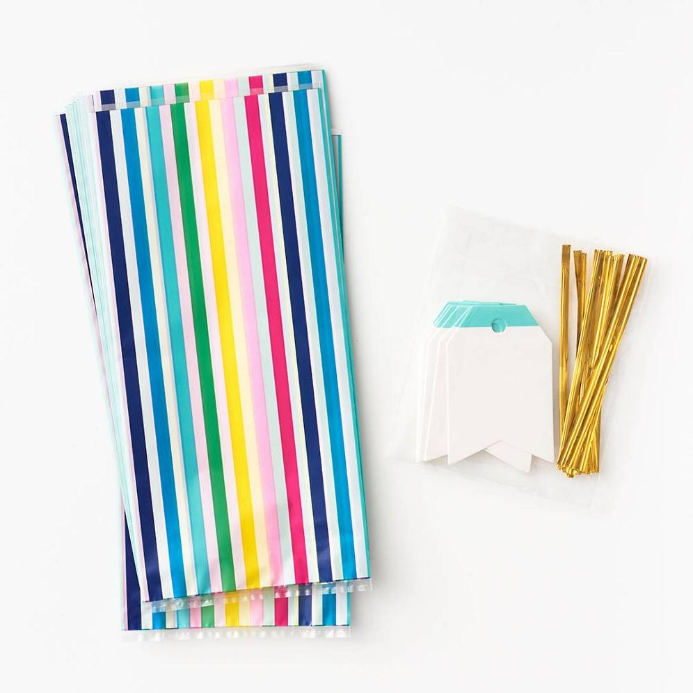Fill these festive food-safe cellophane bags with fun goodies and treats for family and friends. Printed with our colorful multi-stripe pattern. these clear bags are big enough to trim to the size you need. Plus. they come with tags and ties for easy presentation!