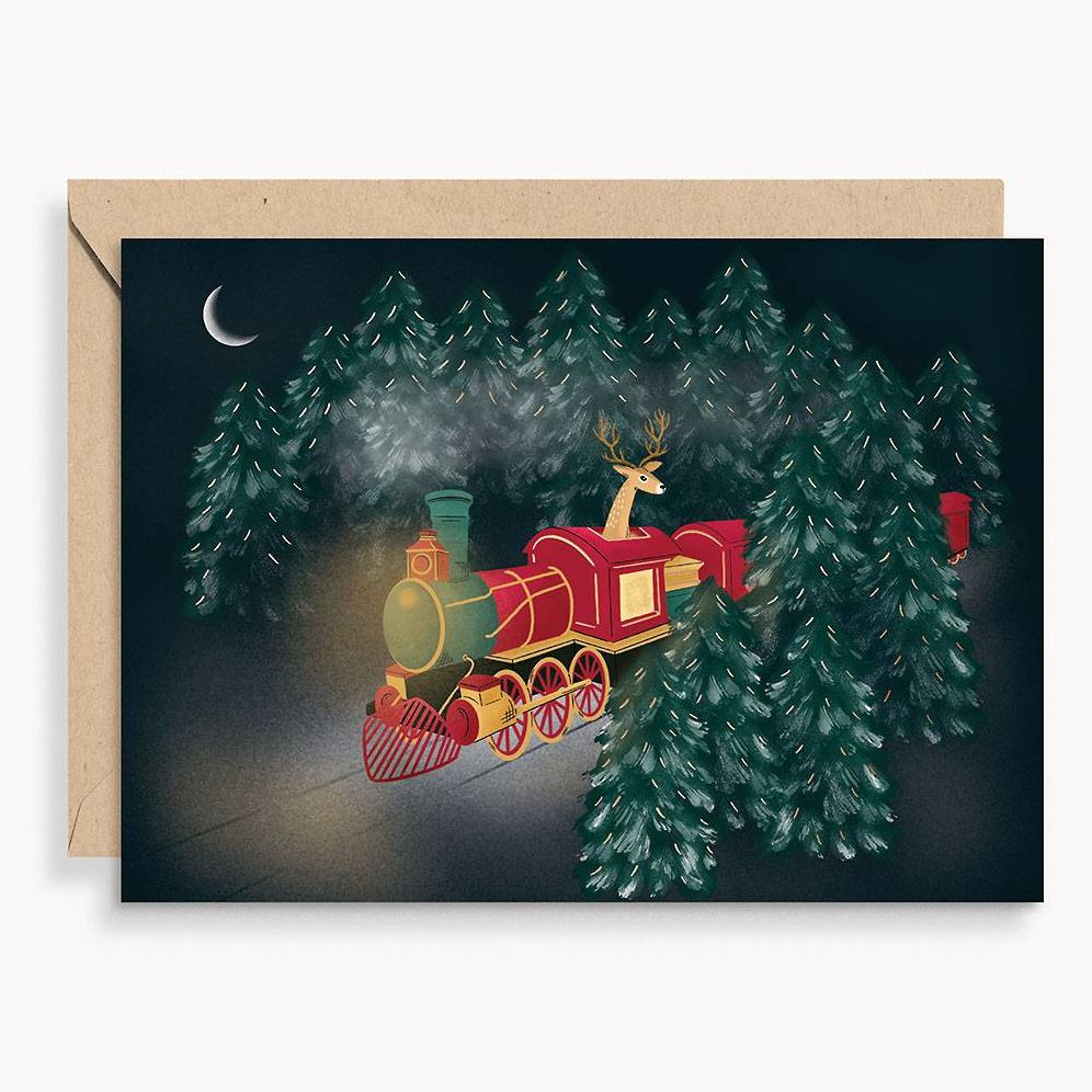 Choo Choo. it’s that time of year again! This adorable card is perfect to send love this holiday season. Inside sentiment reads. May the magic of the holiday season fill your heart with wonder and delight. Features foil details. Folded card. Paired with matching envelope. Designed by Paper Source.