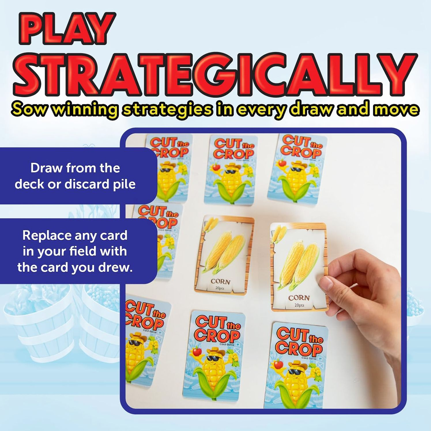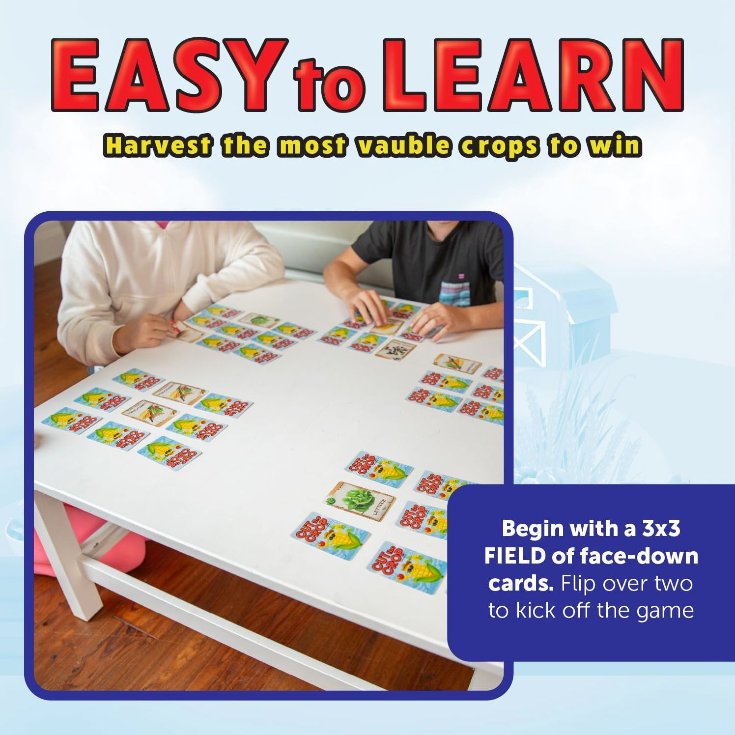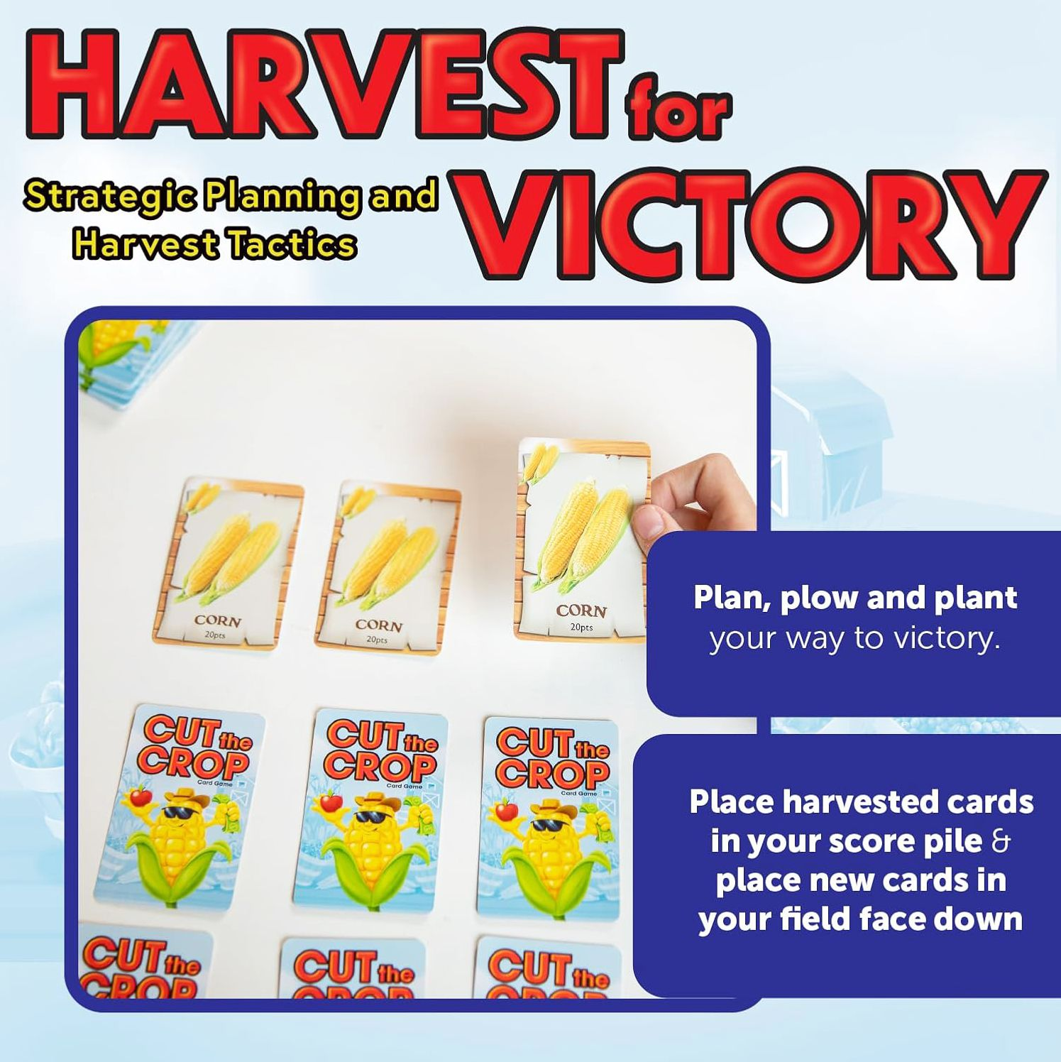 In Cut the Crop card game. you reap what you sow. You are a farmer working your fields to plant and harvest the most valuable crops. Plant three matching crops in a row and you can harvest them to score points. Be careful not to pass along crops your opponents need. Also look to harvest crops on contract or in the market to score bonus points. Do you harvest easy points now or hold for higher points later? The player who manages their fields best wins.