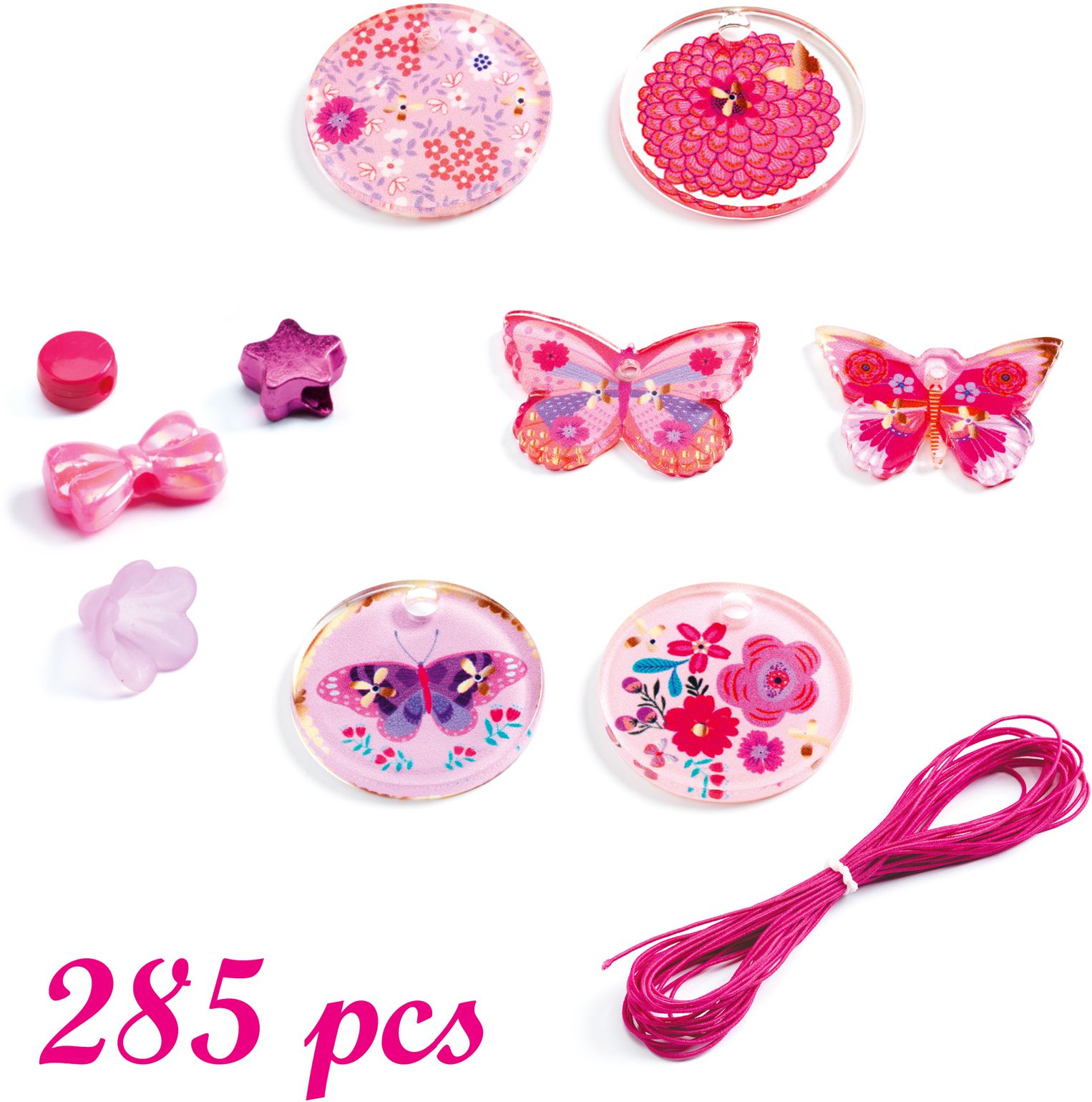 A set containing 285 acrylic beads and 6 Butterfly pendants for making pretty jewelry. A range of colors carefully selected to produce beautiful results every time. Children thread the beads onto the cord however they choose to make pretty necklaces and bracelets.