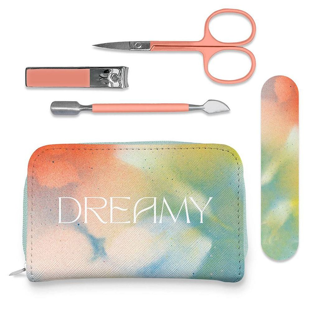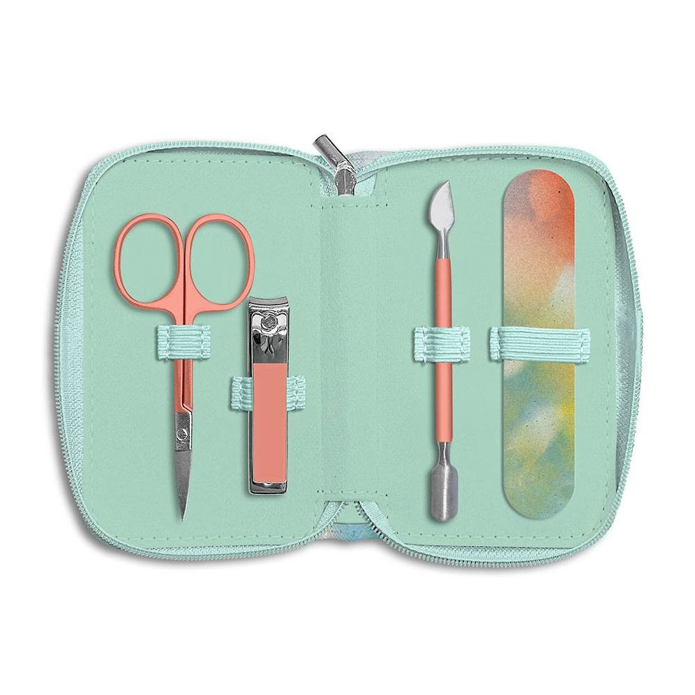 These five-piece manicure sets feature delightful full-color artwork and come with everything you need for perfectly groomed nails. The zippered travel-size case is made of a water-resistant vegan PU material and holds matching nail clippers. scissors. a cuticle pusher. and an emery board. Keep one in your handbag. overnight bag. or desk drawer.