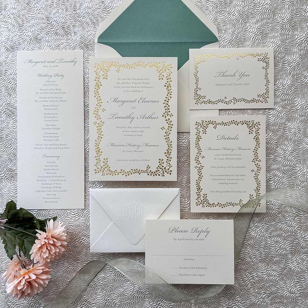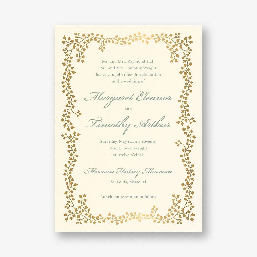 Whether you’re dreaming of a winding English garden or a posh stately affair; rustic charm and classic sophistication meet in this design’s shimmering foil detail and climbing ivy design. Printed on Mohawk superfine softwhite 130 lb. card stock that is soft to the touch and matches our superfine softwhite envelopes. This paper is FSC certified. with 30% post consumer recycled content. and made using wind power. This design was created by our in-house designers at Paper Source.