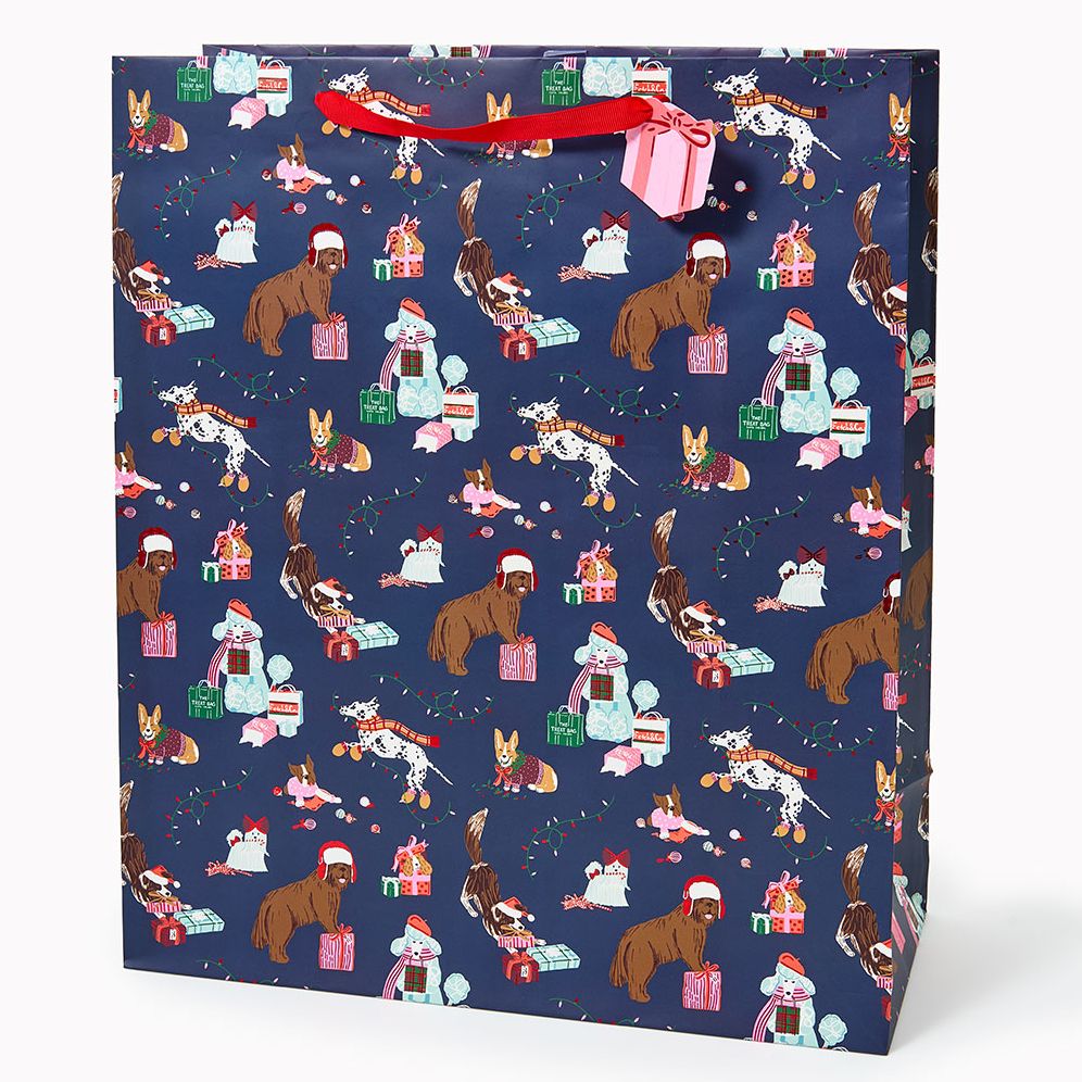 These good boys know how to celebrate the holidays! Our adorable dog friends bring the fun on this extra-large gift bag. Features red ribbon handles and a giftbox shaped tag.