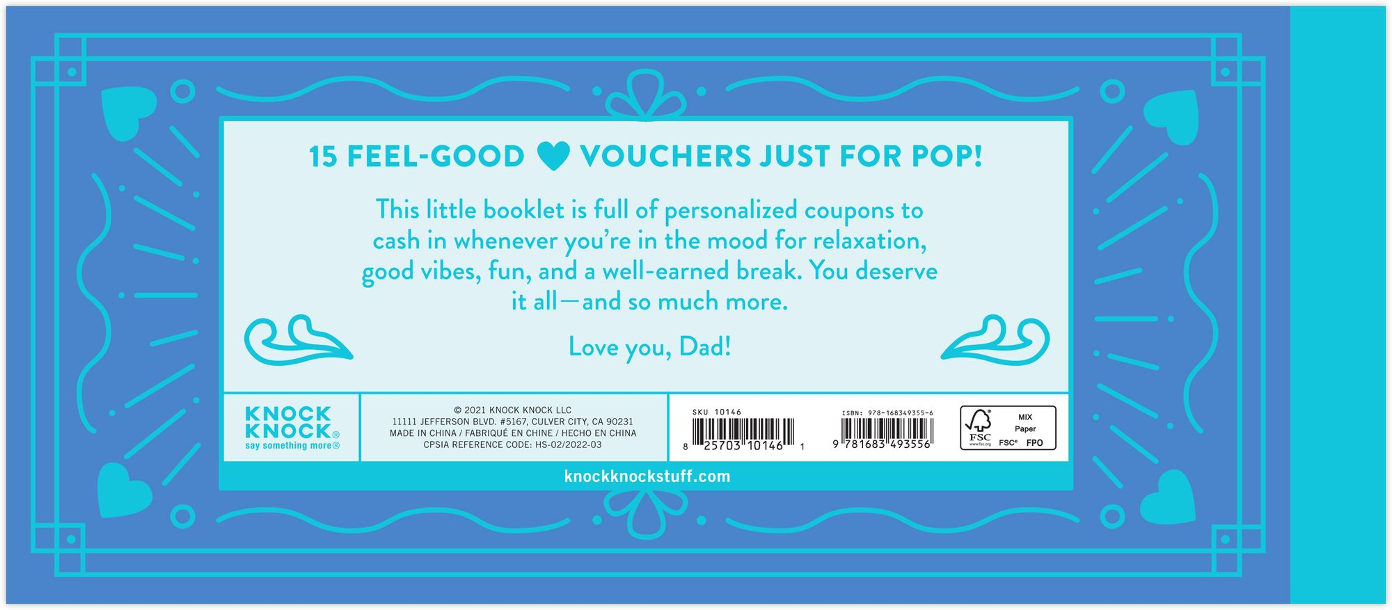Let Dad know he’s loved. appreciated?Cand not just someone who grills a mean kabob and tried to make you learn drums so you could play in his band?Cwith this dazzling booklet of personalizable. feel-good coupons. Simply fill out all 15 vouchers and hand ’em over to be cashed in anytime for props. favors. fun. bonding. and some well-earned high fives.