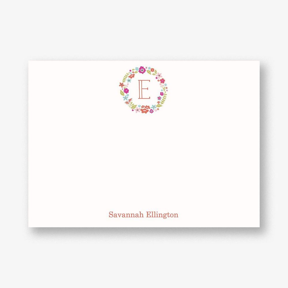 Your initial surrounded by a feminine floral wreath creates a sweet and charming look. Printed on superfine white paper. which has a smooth finish and is soft to the touch. 130# cover weight paper with 30% post consumer recycled content.