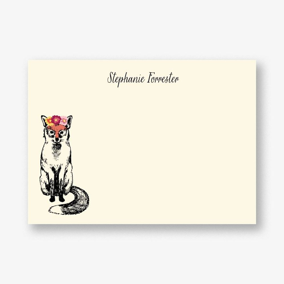 Forest critters add a whimsical touch to this personalized stationery set with a hand-drawn fox wearing a crown of flowers. Printed on superfine soft white 130 lb. card stock that has a smooth finish and is soft to the touch. Paper is FSC certified and made using wind power.
