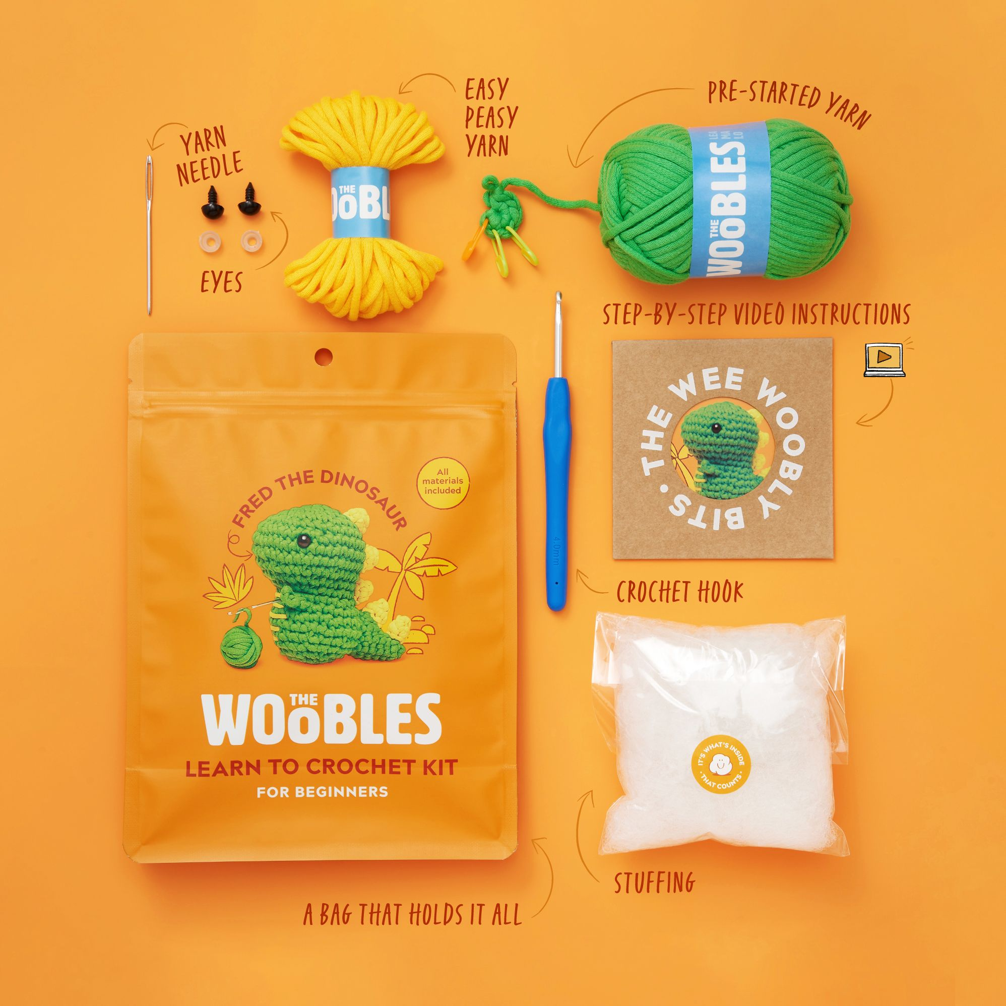 Fred the Dinosaur. The Woobles Beginner Crochet Kit