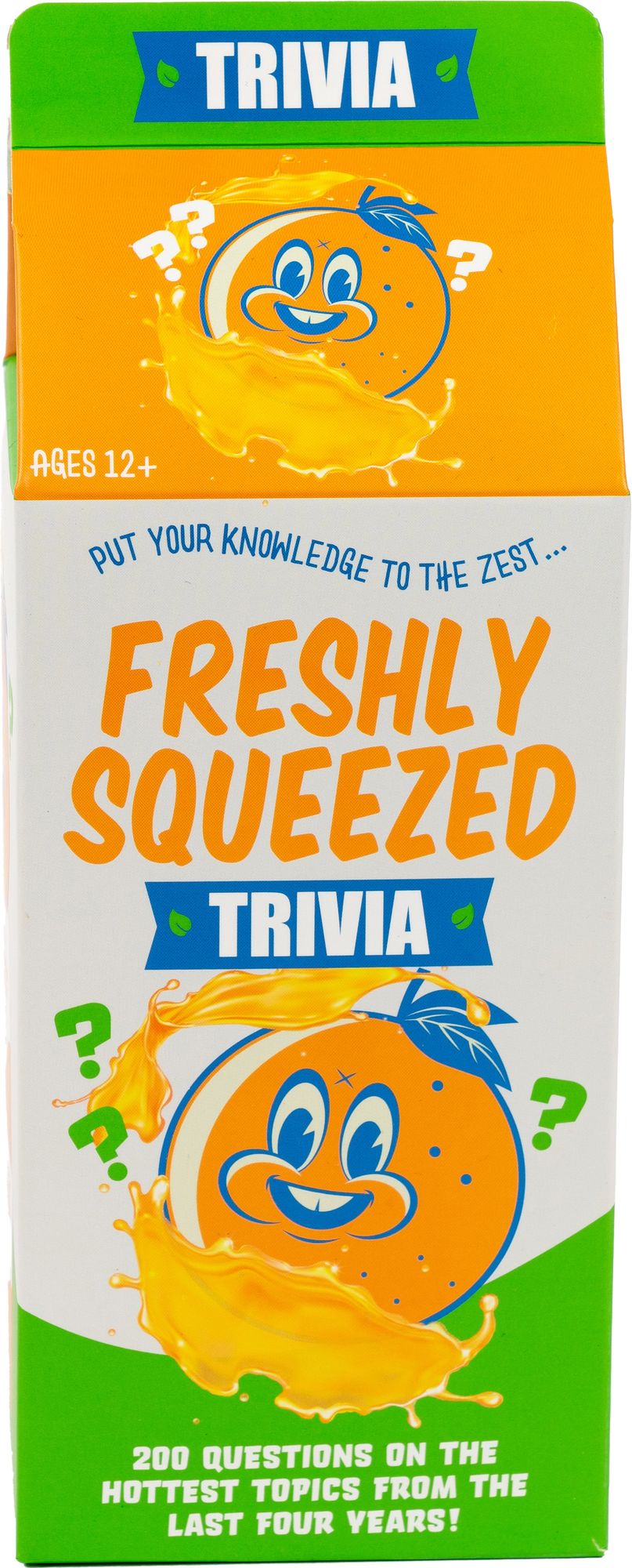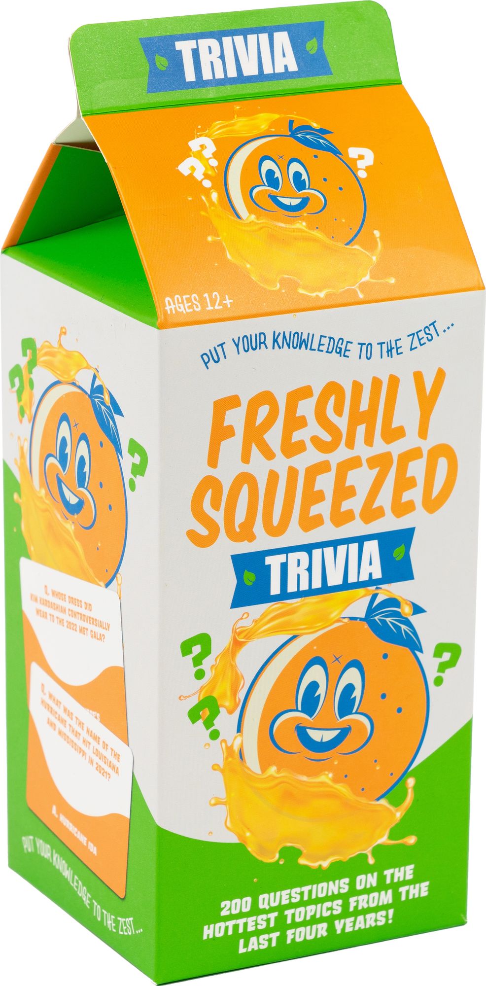The Freshly Squeezed Trivia Game Set stands out with its unique packaging. designed to resemble a carton of orange juice. complete with a splashy. cheerful orange character that’s sure to brighten up your shelf and become a conversation starter. The compact size makes it easy to store or take with you to parties. family gatherings. or any social event where you want to add a dash of fun.