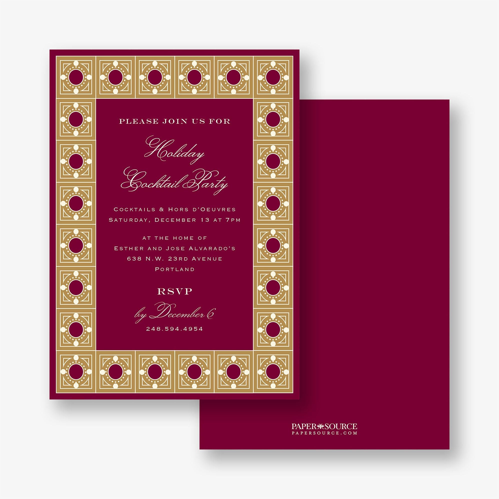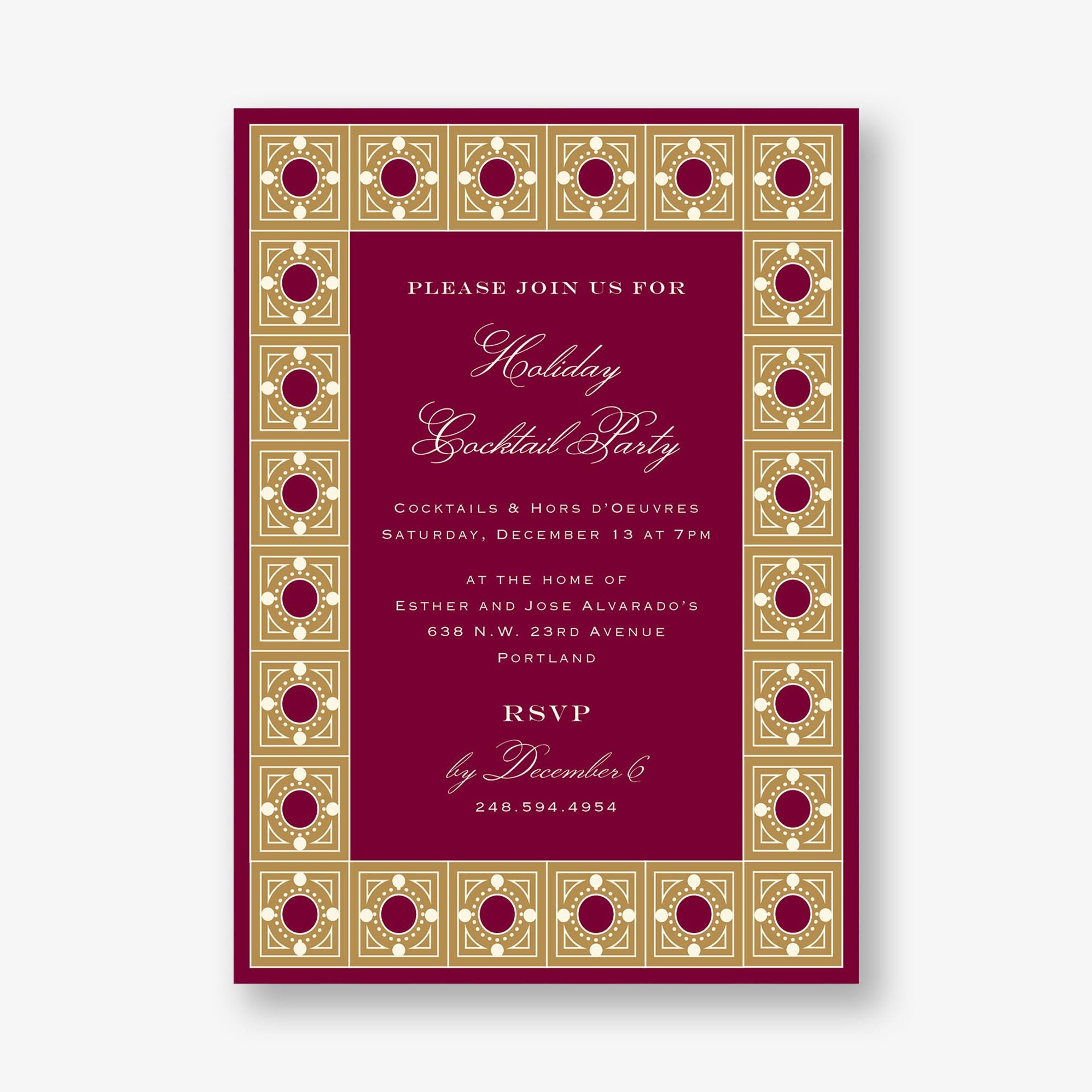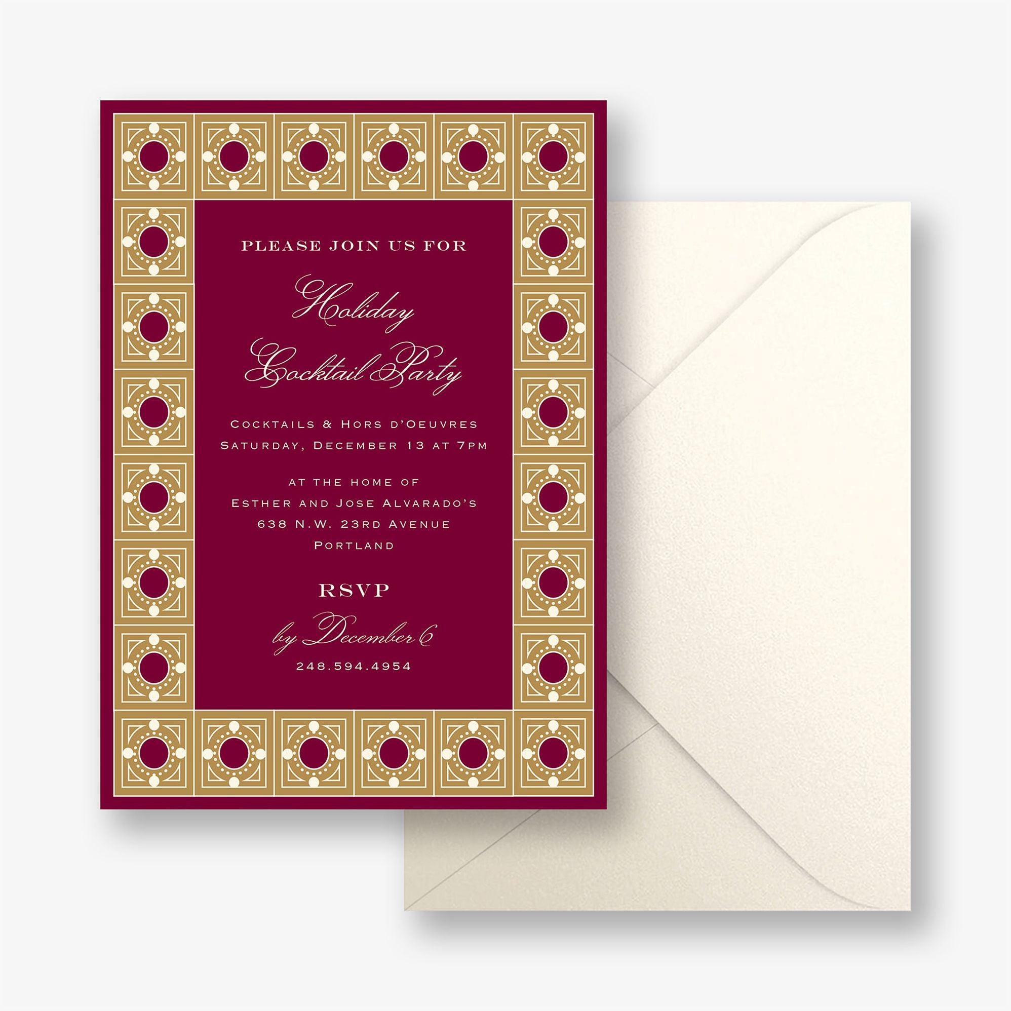 Ideal for sophisticated seasonal soir??es. glamorous gatherings. or a wonderful winter celebration. this invitation is inspired by Neil Lane’s iconic Victorian Garnet & Pearl Bangle Bracelet. This design features deep ruby-red hues framed with ornate. gold-accented detailing reminiscent of the bangle’s antique jewelry settings.