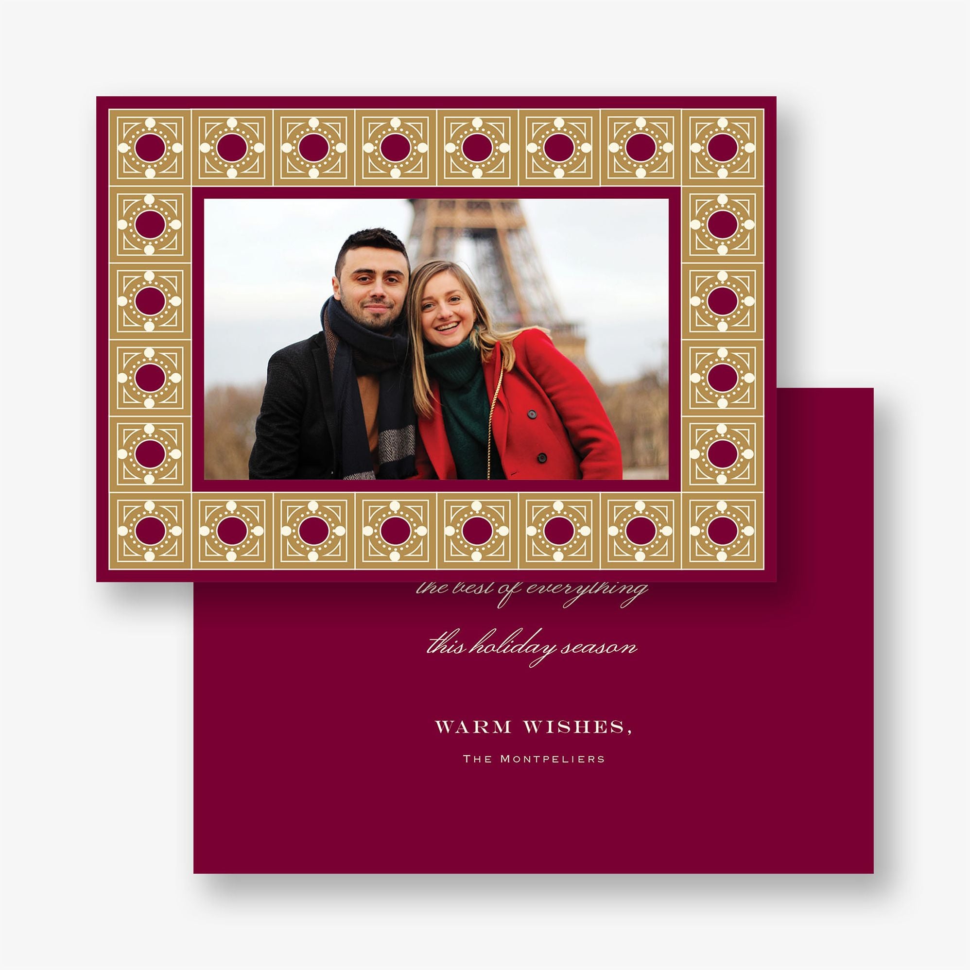 Inspired by Neil Lane’s Victorian garnet and pearl bangle bracelet. this holiday photo card features a rich garnet-hued tile border. accented with delicate. pearl-like detailing that echoes the beauty of vintage heirloom jewelry. The design frames your photo like a treasured keepsake and adds a touch of old-world glamour to your most cherished memories.