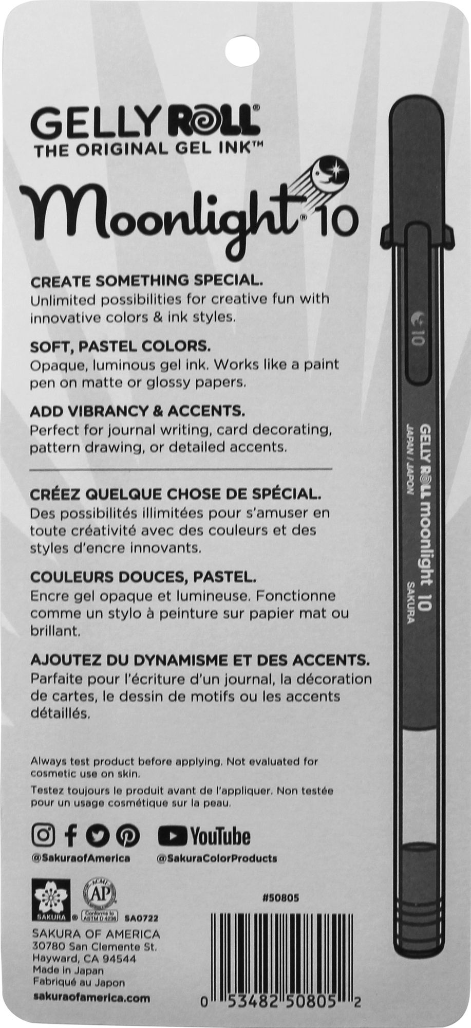 From the iconic. nostalgic Gelly Roll line. the unique paint-like quality and performance of Moonlight is ideal for both white and dark papers. The creamy. smooth. opaque ink is perfect for drawing. doodling and coloring.