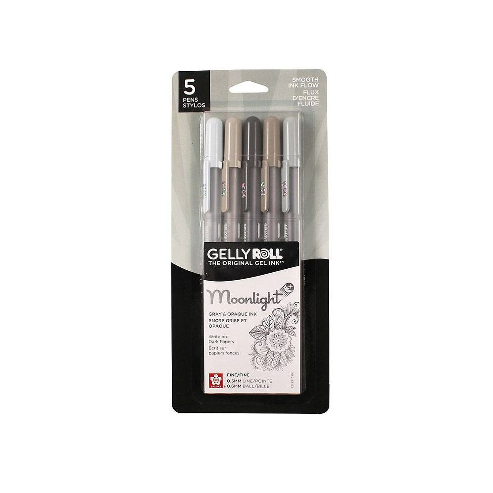 Gelly Roll Moonlight 06 from Sakura of America now includes Greys! The 5 pack includes the colors Blue Gray. Light Warm Gray. Cool Gray. Warm Gray and Green Gray. The unique paint-like quality and performance of Moonlight is ideal for both white and dark papers. The fine line allows for the ink to dry with very little wait time. minimizing the risk of smearing. The opaque ink is perfect for writing in journals. decorating cards. pattern drawing or detailed accents. Not recommended for use on fabrics intended to be washed and not evaluated for cosmetic use on skin. Meets ACMI non-toxicity standards.