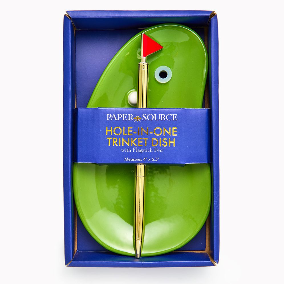 Keep your desktop essentials on par with this ceramic trinket dish and pen set! Includes a unique pen with a flag topper that securely slots into the tray.