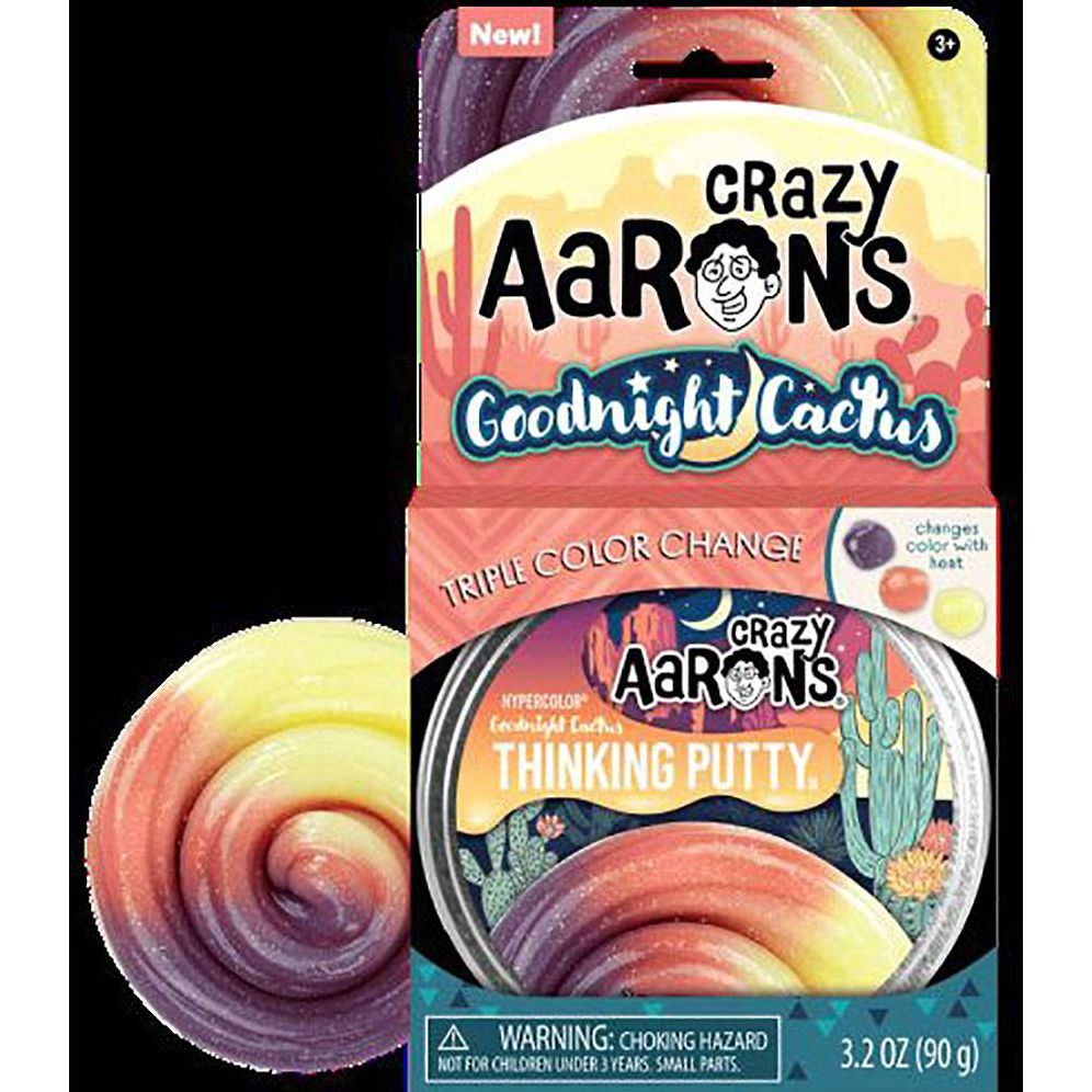 Mimicking a magnificent desert sunset. Goodnight Cactus Thinking Putty® changes color with the heat of your hands. This triple change Hypercolor® captures the peaceful purple. luminous orange. and radiant yellow sundown of the night sky.