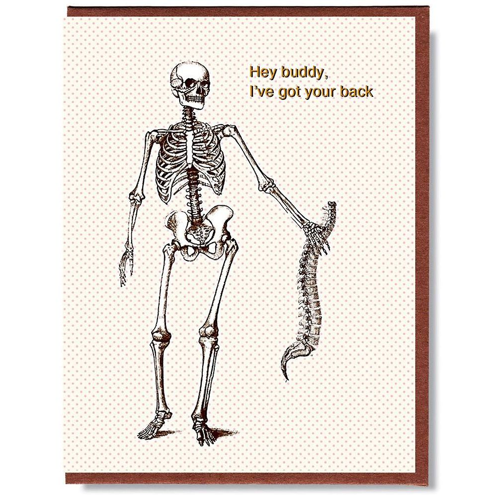 This card features a skeleton holding a back bone with the sentiment Hey buddy. I’ve got your back. This kitschy card is great for any friend to let them know you have their back!