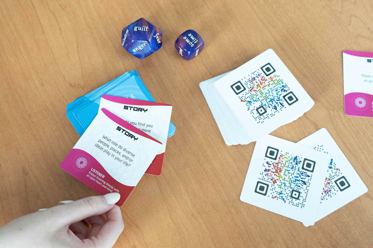 Players roll the Time and Space dice. draw a Story Card with questions and prompts. and share. Anyone at the table can use their personal Gratitude or Curiosity Cards to thank the speaker or deepen the conversation with questions and insights. QR codes lead players to additional content online from Deepak Chopra.