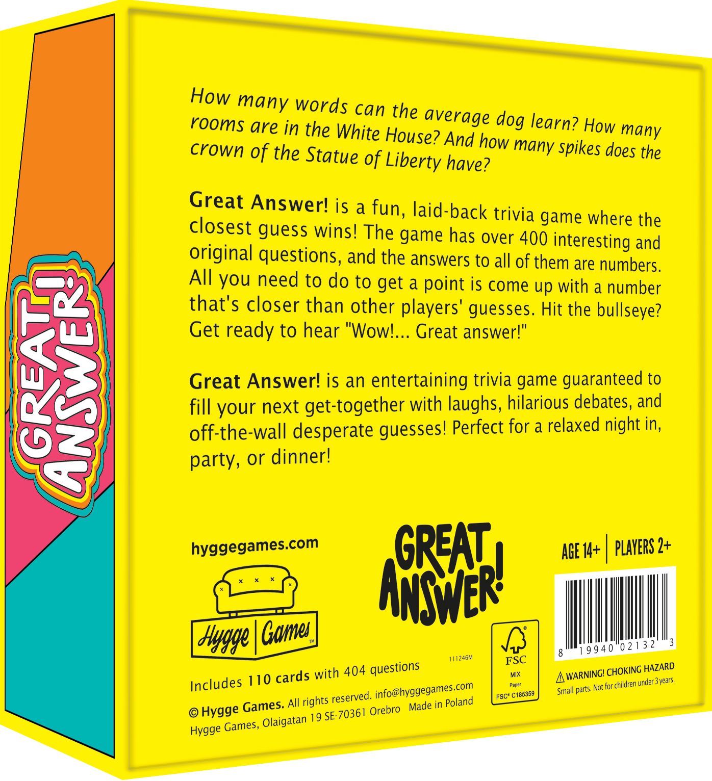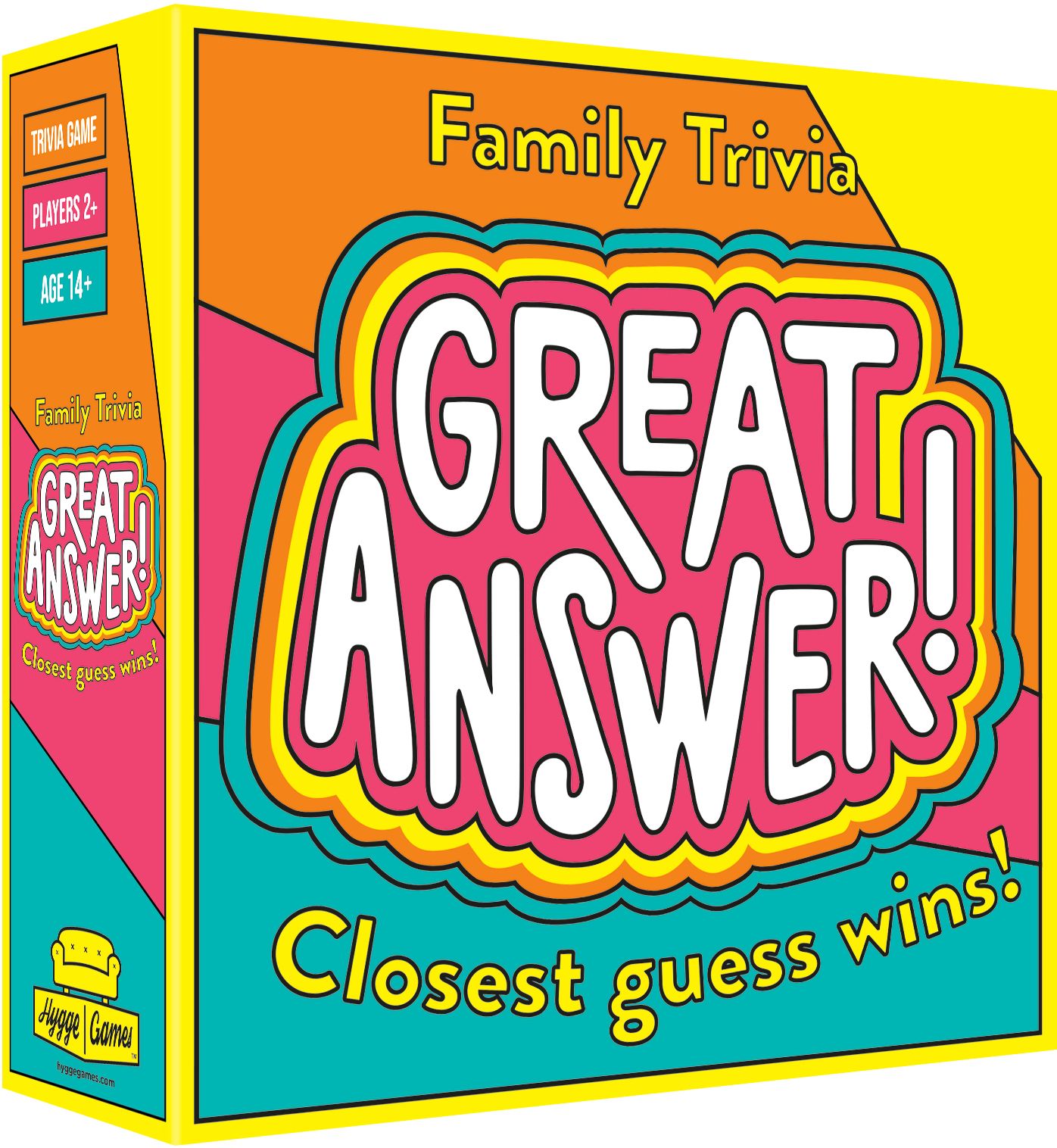 Great Answer! is an entertaining trivia game guaranteed to fill your next get-together with laughs. hilarious debates. and off-the-wall desperate guesses! Perfect for a relaxed night in. party. or dinner!