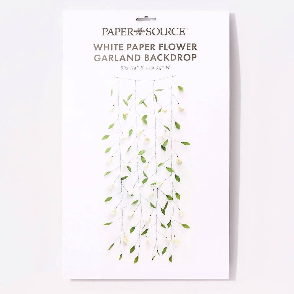 Bring the garden inside with this beautiful hanging backdrop! Featuring trailing crepe paper greenery with delicate white blossoms. it’s perfect for a spring photo backdrop. or just brightening up your room. Paper Source exclusive.