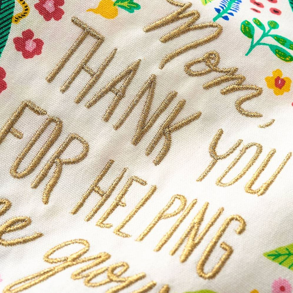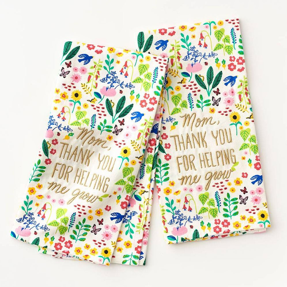 This Paper Source exclusive tea towel set shows a beautiful wildflower meadow and the words Mom. thank you for helping me grow in gold lettering!