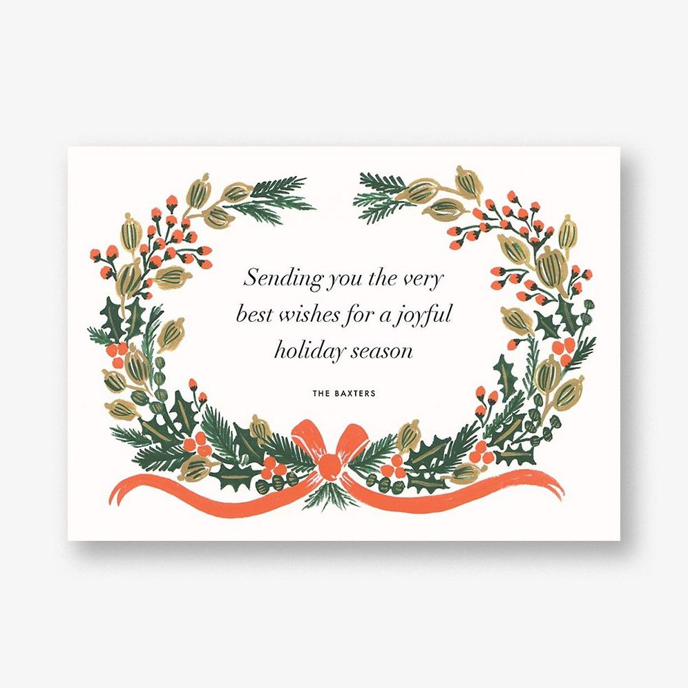 A holiday greenery wreath outlines your message on this simple yet meaningful card.