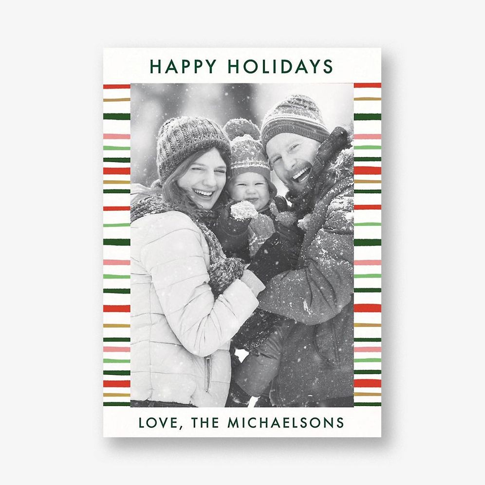 Let holiday tidings ring from home to home with this tasteful holiday photo card. Send a warm and loving message to friends and family with one of our unique custom holiday cards. featuring artwork created by our designers in Chicago. Printed on Mohawk ultra white 120 lb. card stock that is soft to the touch and matches our superfine white envelopes. Paper is FSC certified and made using wind power.