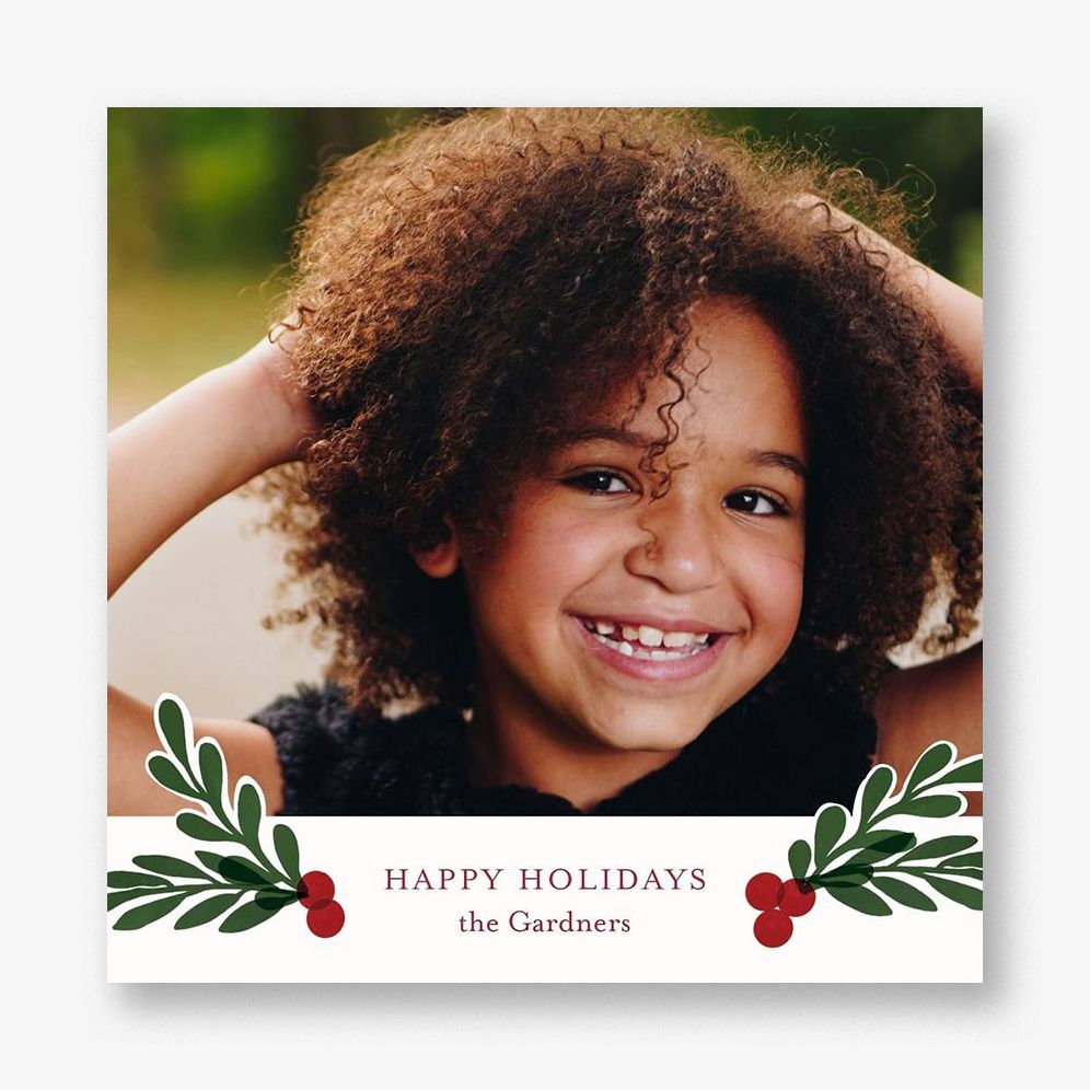 Two cheery sprigs of holly with bright red berries embellish your favorite family photo on this festive holiday card. designed by Paper Source.