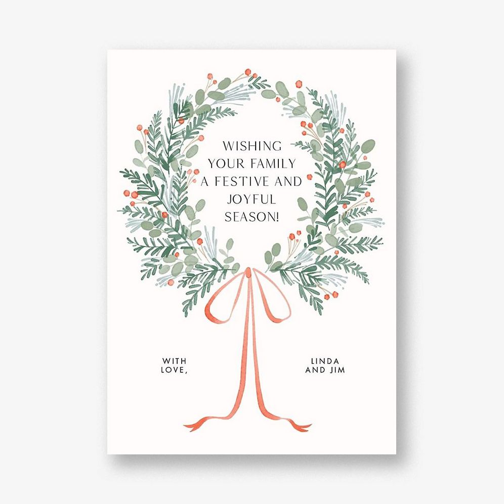 The classic holly wreath design. a symbol of festive joy and togetherness. captures the spirit of the season to share warm wishes and nostalgia with your loved ones. Printed on Mohawk 120.0 lb Superfine Ultra White. This paper is FSC certified. with 30% post consumer recycled content. and made using wind power.