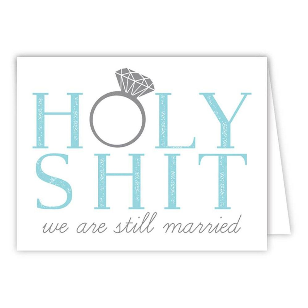 A funny card to share with your significant other on your anniversary! This greeting card reads Holy Shit we are still married. O in Holy is a ring with silver glitter detailing.
