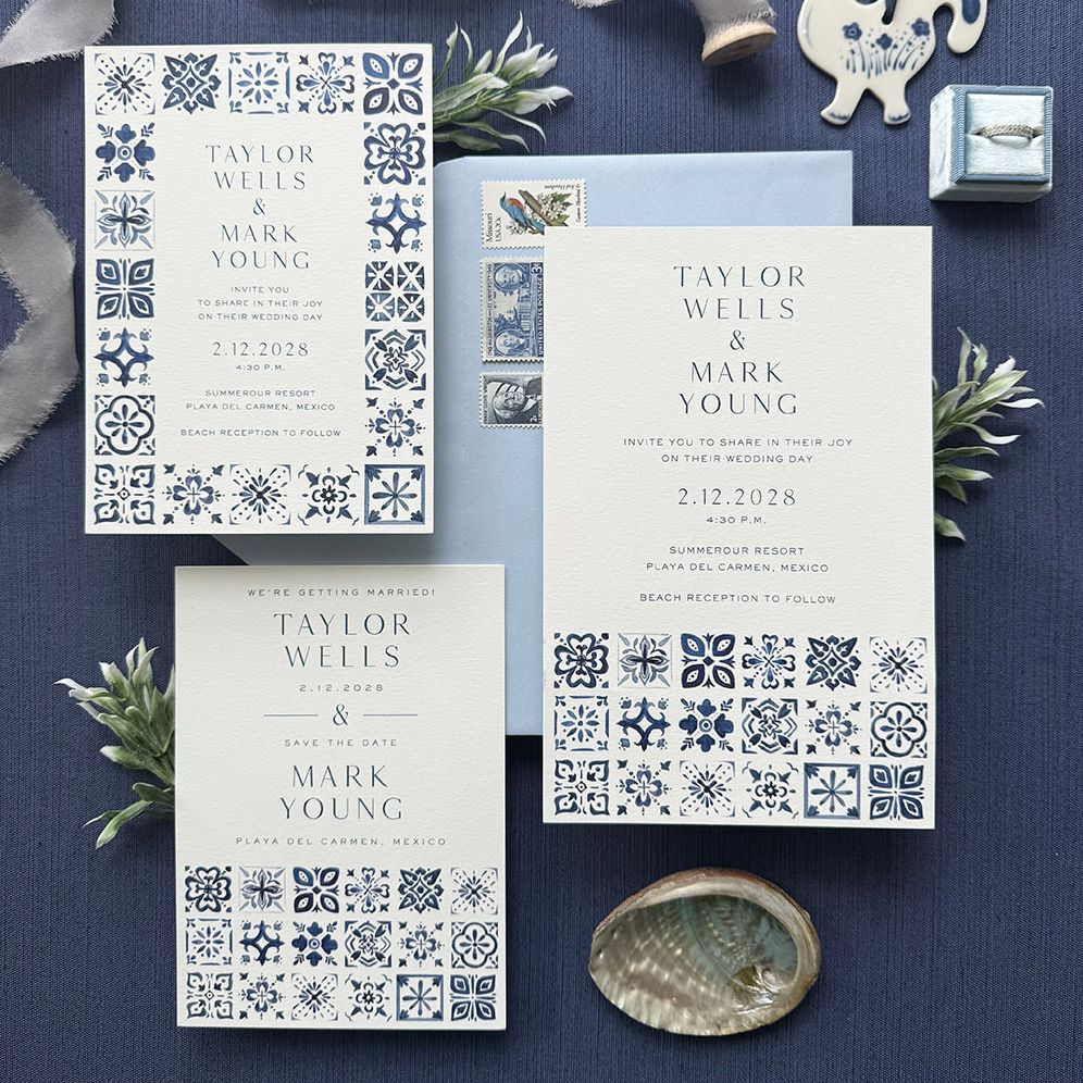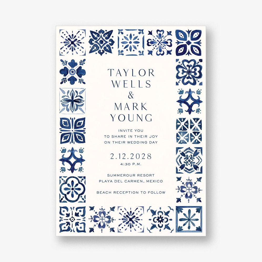 Inspired by the classic hand-painted tiles. this invitation summons thoughts of blue waves and sandy shores. perfect for a coastal inspired wedding whether you’re celebrating close to home or sailing away to a sunny destination.