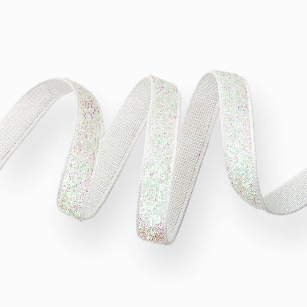 Add a dash of luxury to your next gift wrap project with this Iridescent glitter white ribbon. Ideal for adorning gift boxes or treat bags. this glitter ribbon is a finishing touch with a silken punch!