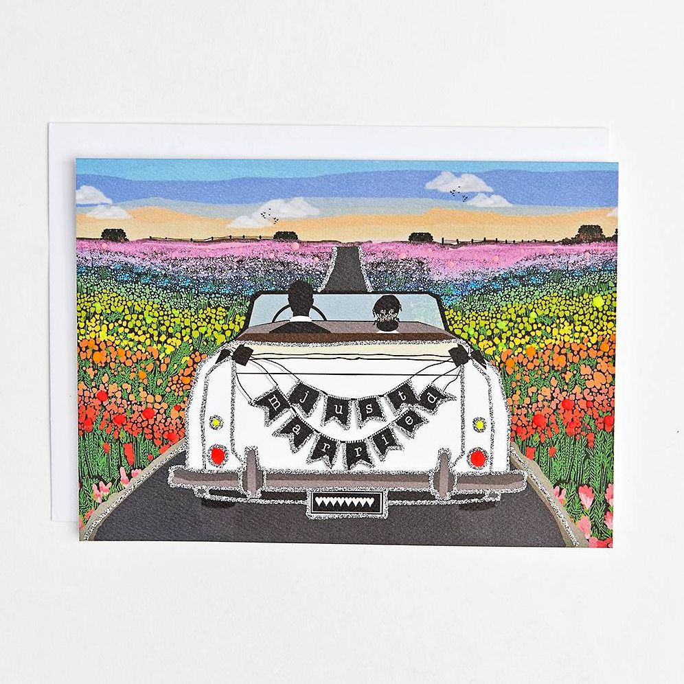 Send a message of well wishes to the bride and groom! This hand-embellished card features a white convertible driving off into the sunset with a “Just Married” banner on the back. Rainbow florals surround both sides of the road. Embellished with bright neon paints and silver glitter.