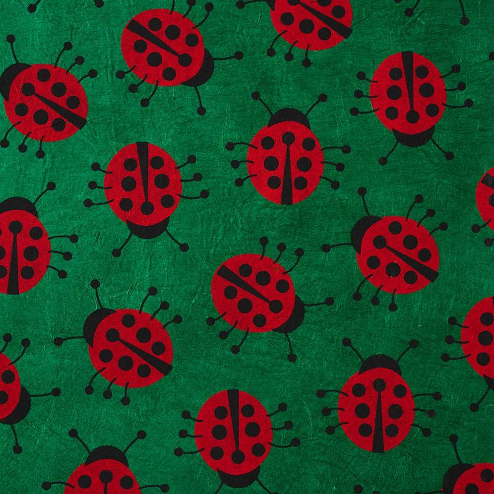 Create a unique wrap or lovely craft project featuring this paper with its sweet lady bug pattern against bright green. Made from the renewable fibers of the Lokta plant. this fine paper is also a green choice for your projects!