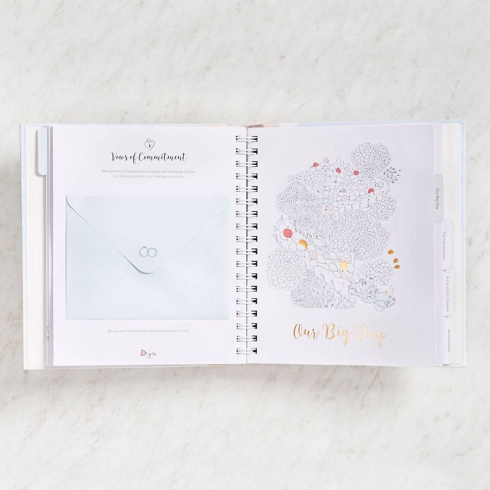 This charming memento offers endless imaginative ways to capturing everything to do with I do! Stash mementos in little envelopes. collect photos of family and friends. stow away notes and wishes for future anniversaries. and record memories both big and small. Decorated with foil and a handsome fabric spine. as well as whimsical illustrations throughout. this keepsake is the perfect way to commemorate a couple’s treasured wedding memories.