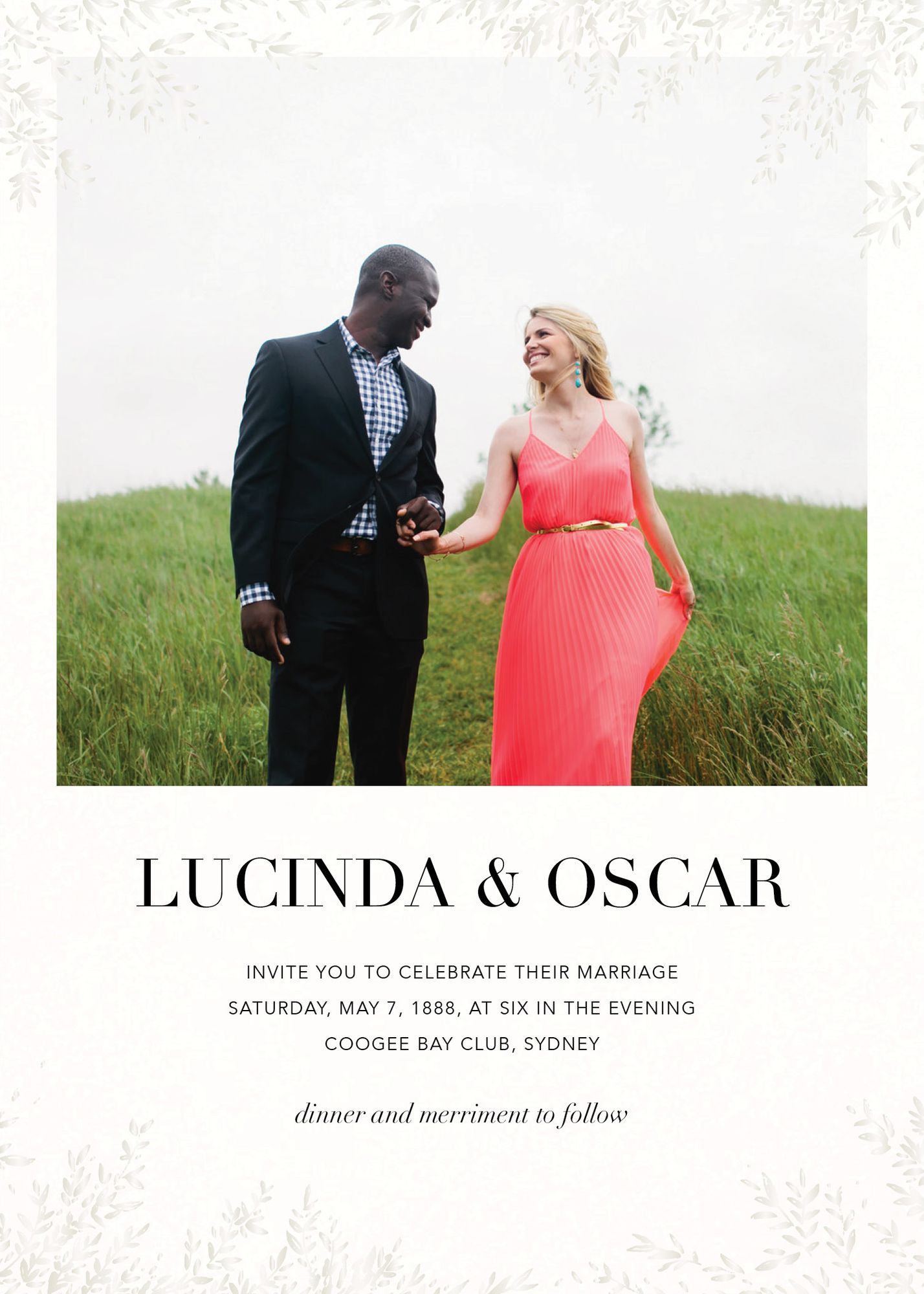 Shining leaves create a wreath around your photographs in this bright design by Paperless Post. Printed on Mohawk superfine white 130 lb. card stock that is soft to the touch and matches our superfine white envelopes. This paper is FSC certified. with 30% post consumer recycled content. and made using wind power. Need to send your annoucement ASAP? You can send with our partners at Paperless Post.